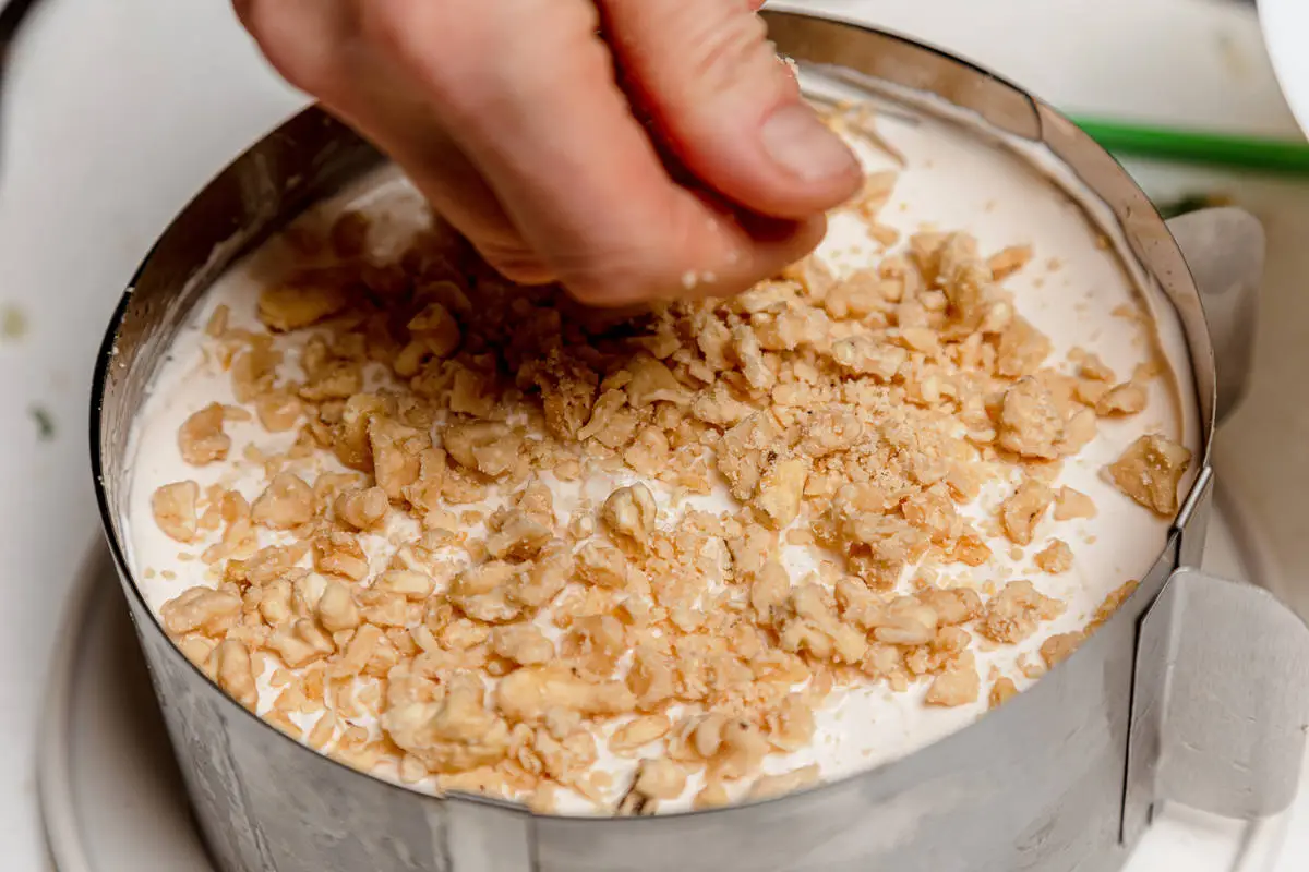 Грецкие орехи измельчите (свежие орехи легко крошатся при надавливании рукой или скалкой).
