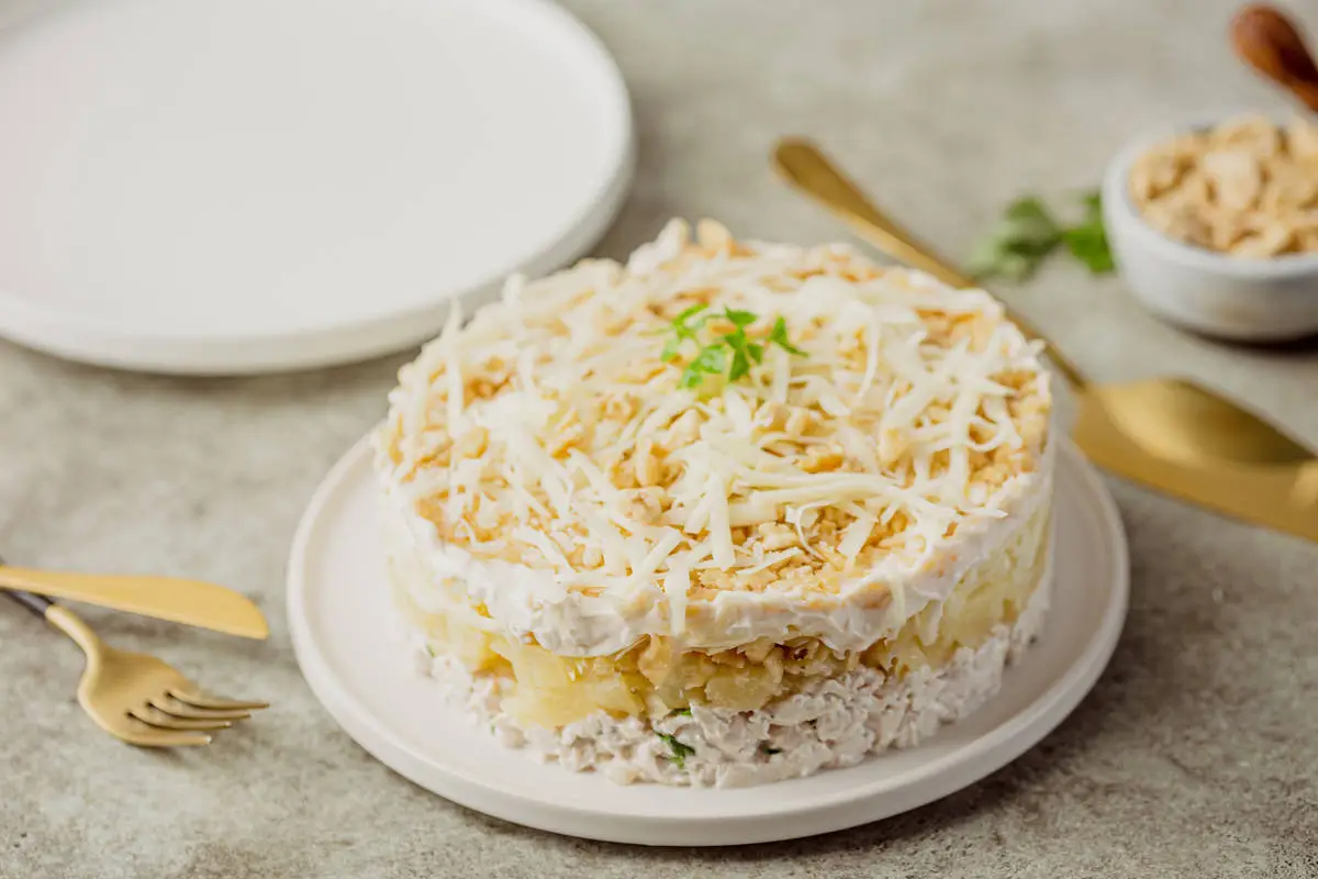 Затем ананас, часть орехов, сыр, а сверху майонез (его нужно распределить по поверхности салата ложкой). Посыпьте верх салата орехами.