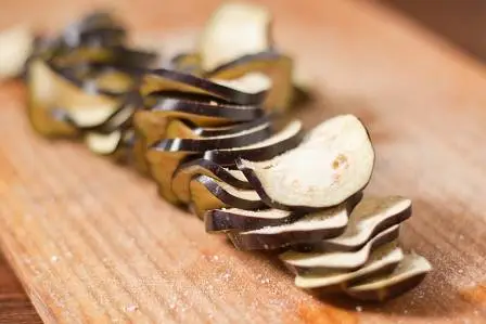 Баклажан нарежьте кружочками, посолите и оставьте на пять минут, слейте сок.
