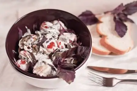 Черри разрежьте на половинки, листики базилика порвите руками, смешайте с баклажанами, поперчите, заправьте сметаной.