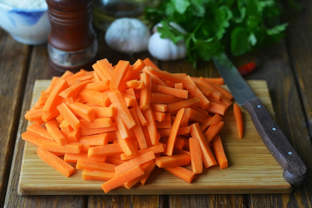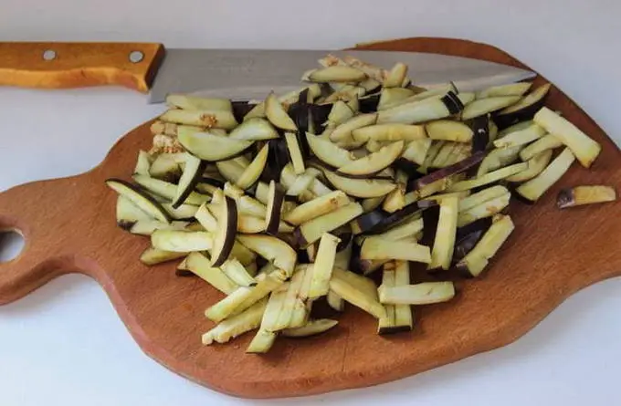 Морковь нарезать брусочками или натереть на тёрке для корейской морковки и обжарить вместе с баклажаном.