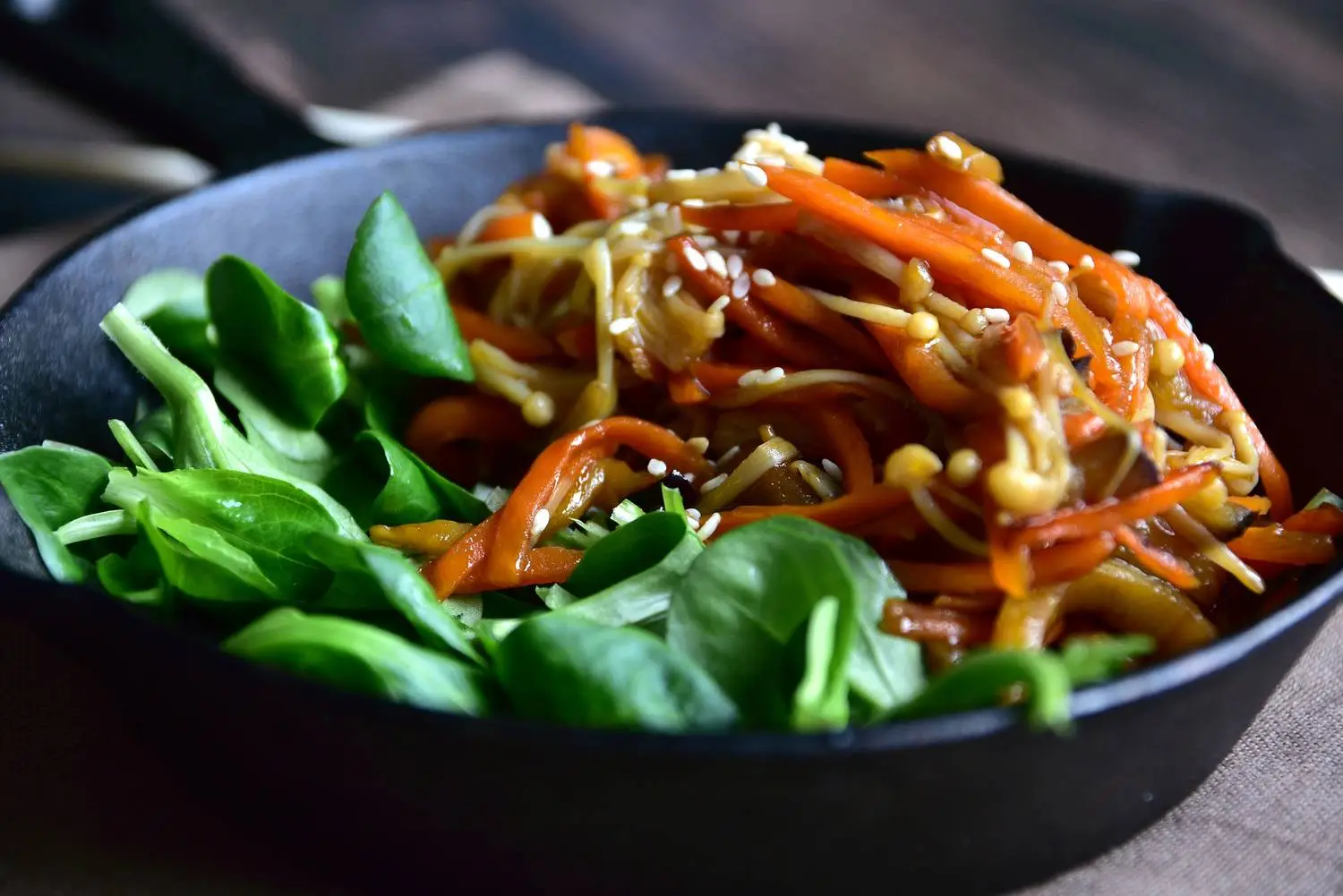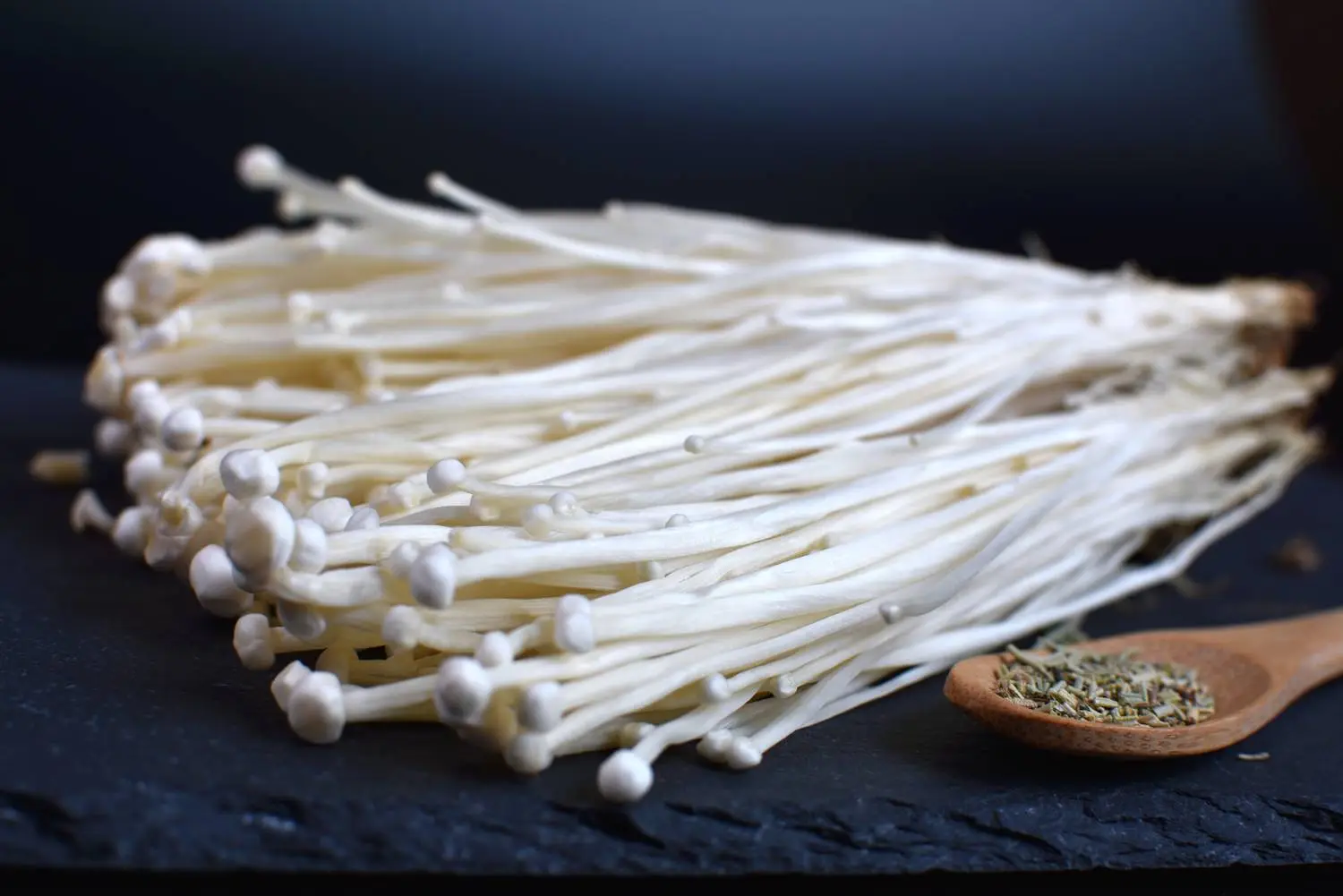 Эноки промыть и добавить к овощам, обжарить ещё 2 минуты. В последнюю минуту добавить в сковороду чили и соевый соус.