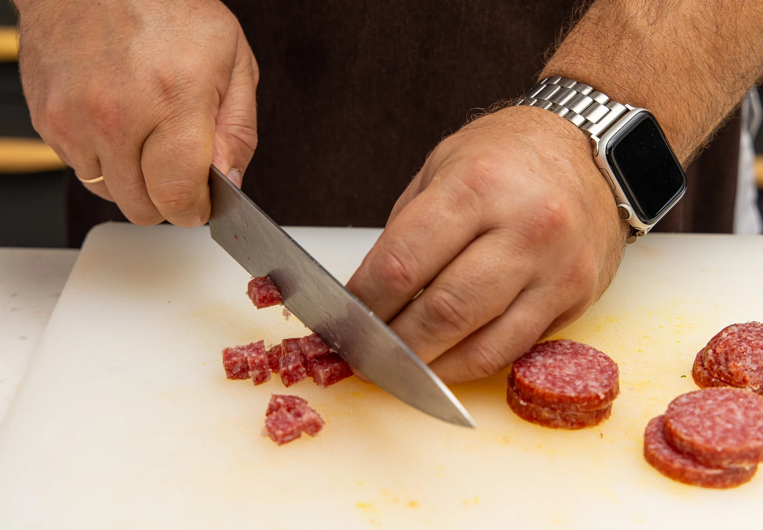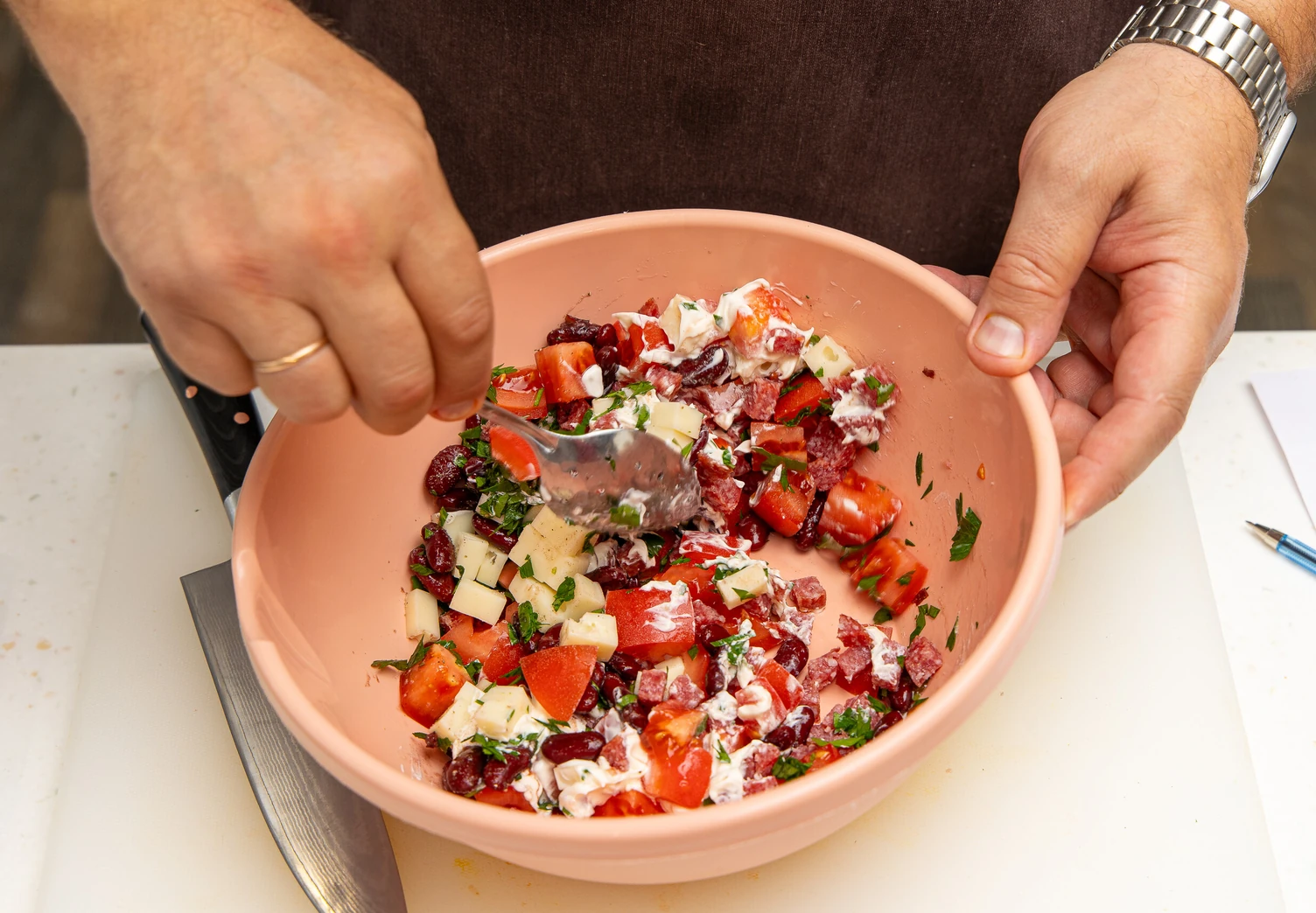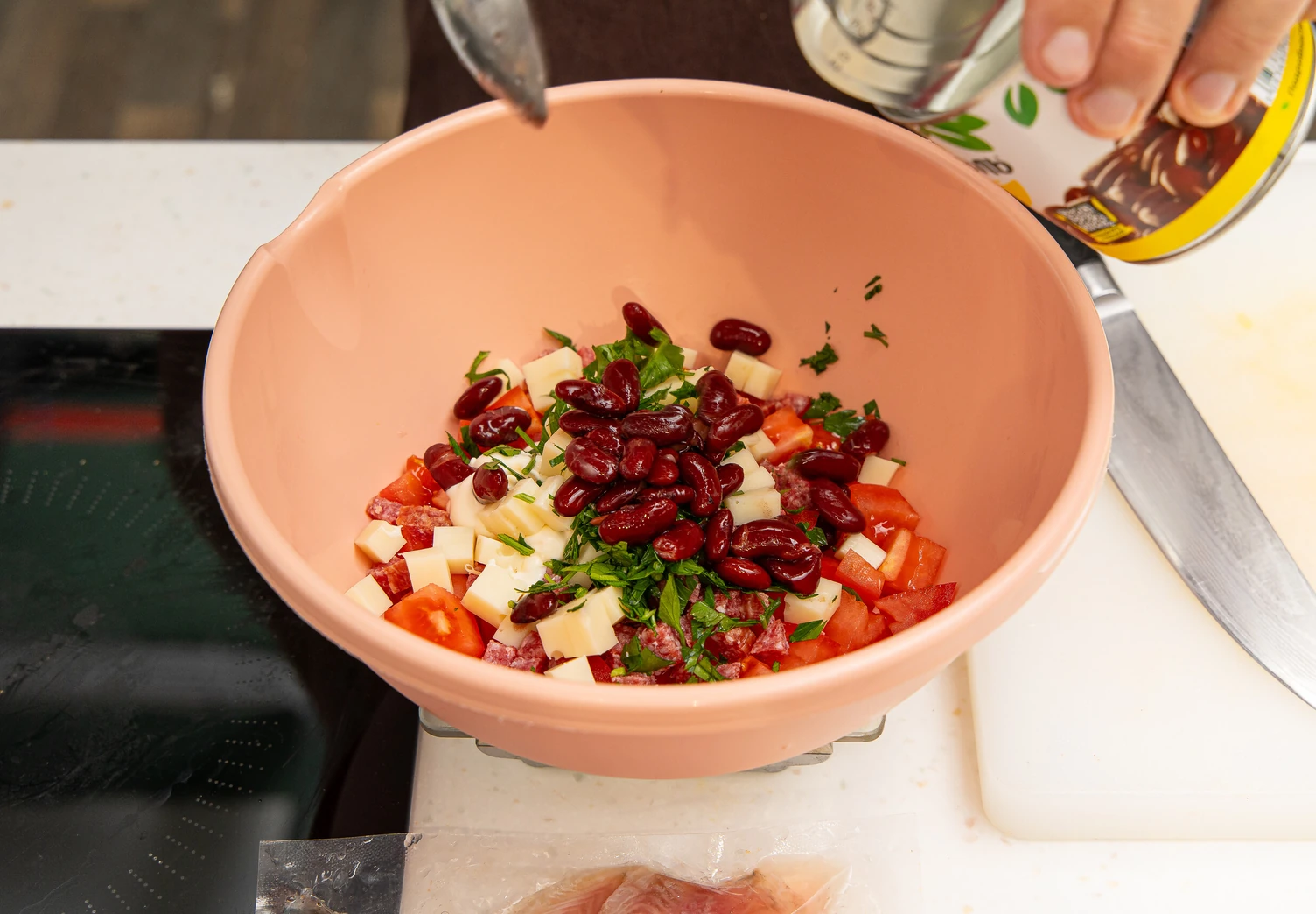 Это простое блюдо собирается за 10 минут, но по насыщенному вкусу и интересному сочетанию ингредиентов не уступает другим популярным салатам с майонезом. Пикантная колбаса, сытная фасоль и хрустящие овощи — беспроигрышный рецепт для любого застолья.