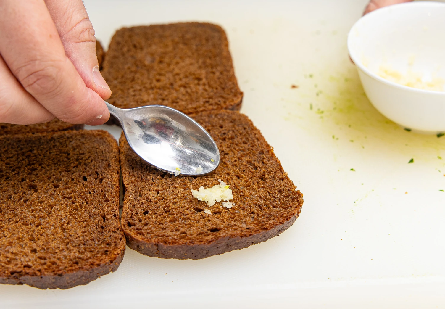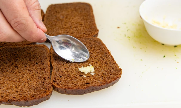 Очистите чеснок и измельчите его на мелкой тёрке или через пресс. Ломтики ржаного хлеба натрите солью и измельчённым чесноком, нарежьте кубиками и подсушите в духовке без масла до хрустящей корочки.