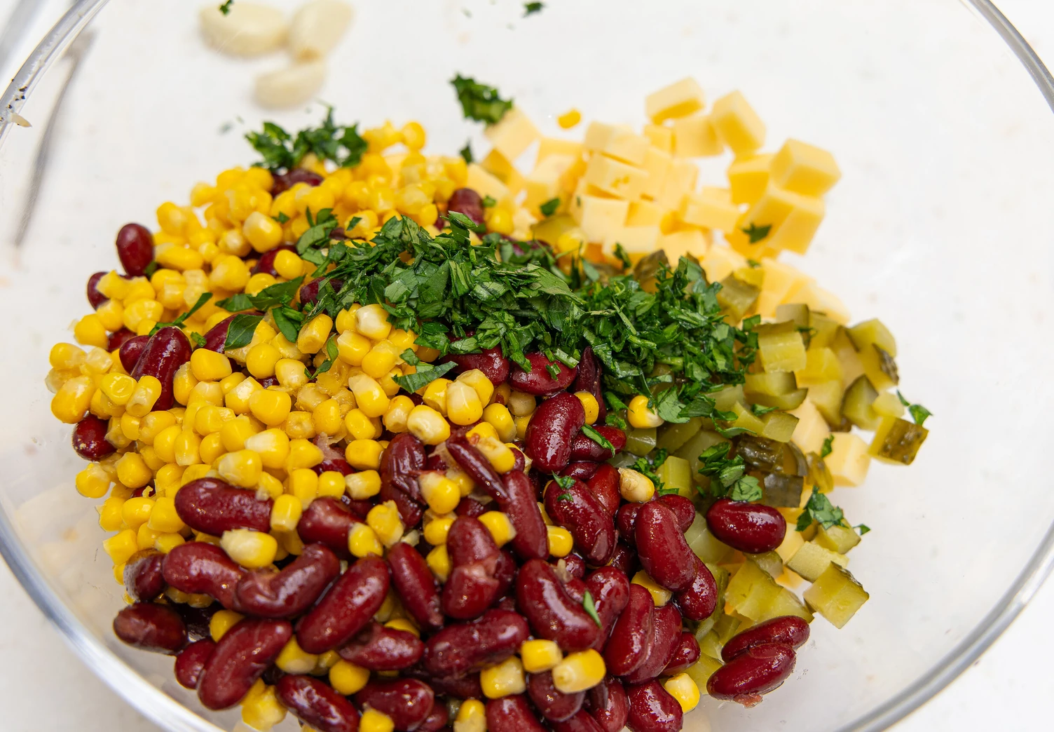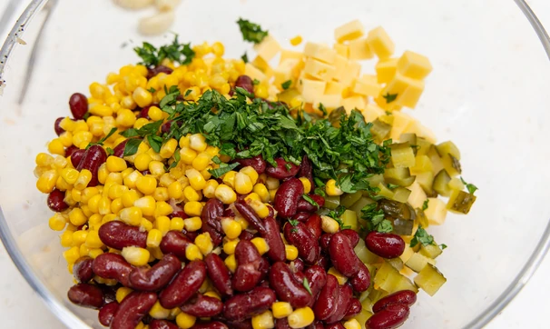 В большой миске смешайте куриное филе, фасоль, сыр, кукурузу, огурцы, петрушку и чесночные сухарики.