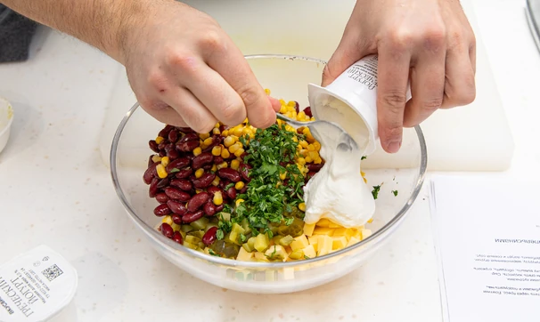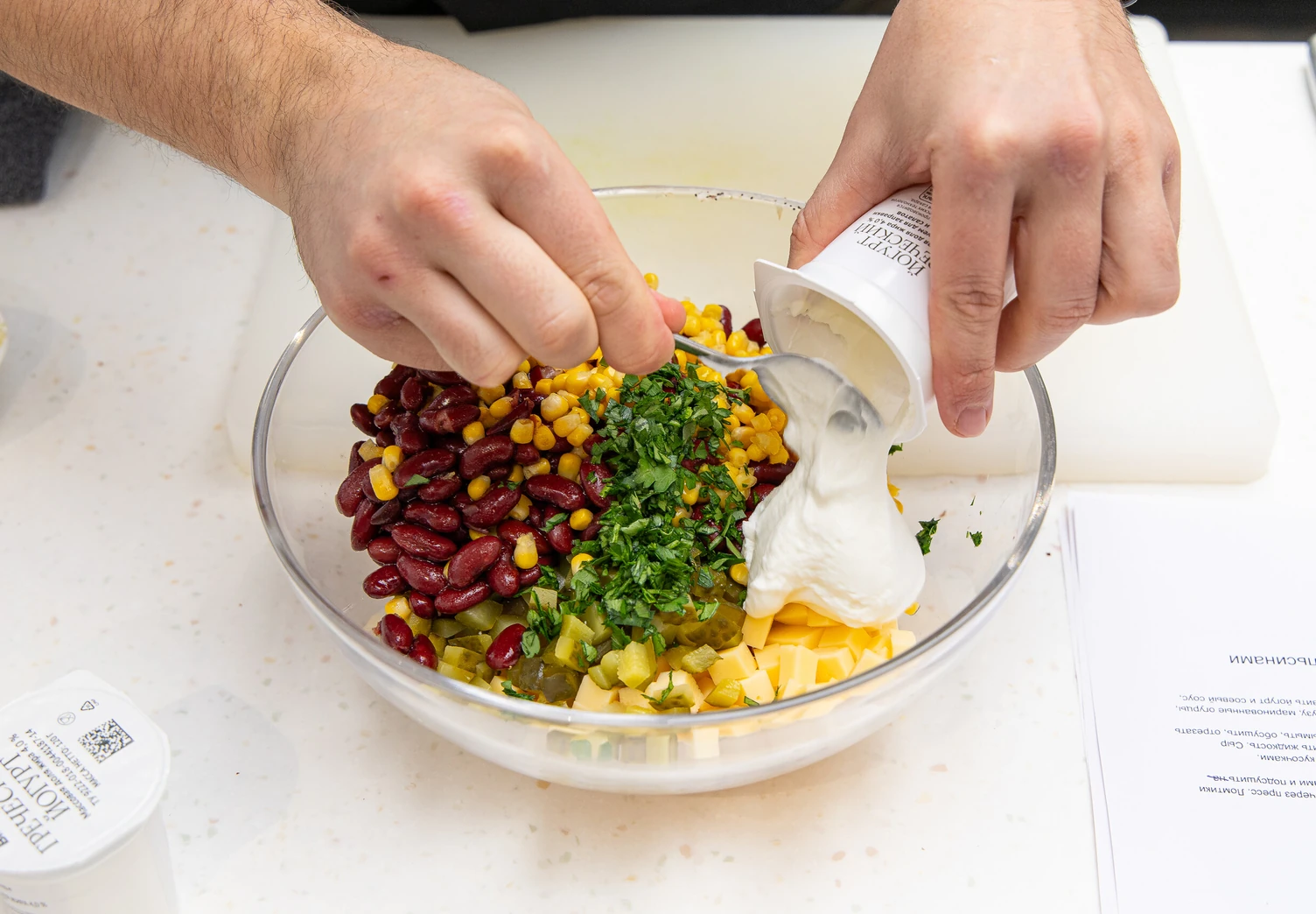 Устали от тяжелых майонезных салатов? Этот рецепт — свежая идея для праздничного стола или простого ужина. Здесь только лёгкость, баланс и яркий вкус: нежное куриное филе, сытная фасоль, хрустящие огурчики и пикантная заправка на основе йогурта.