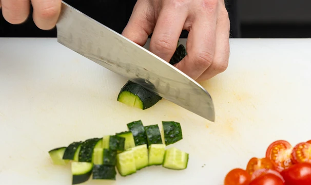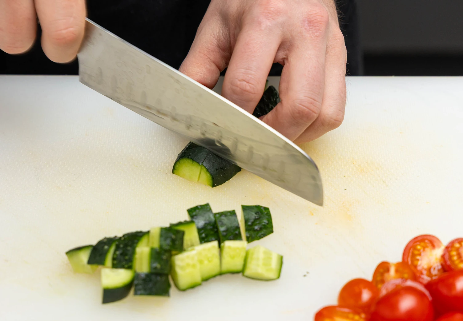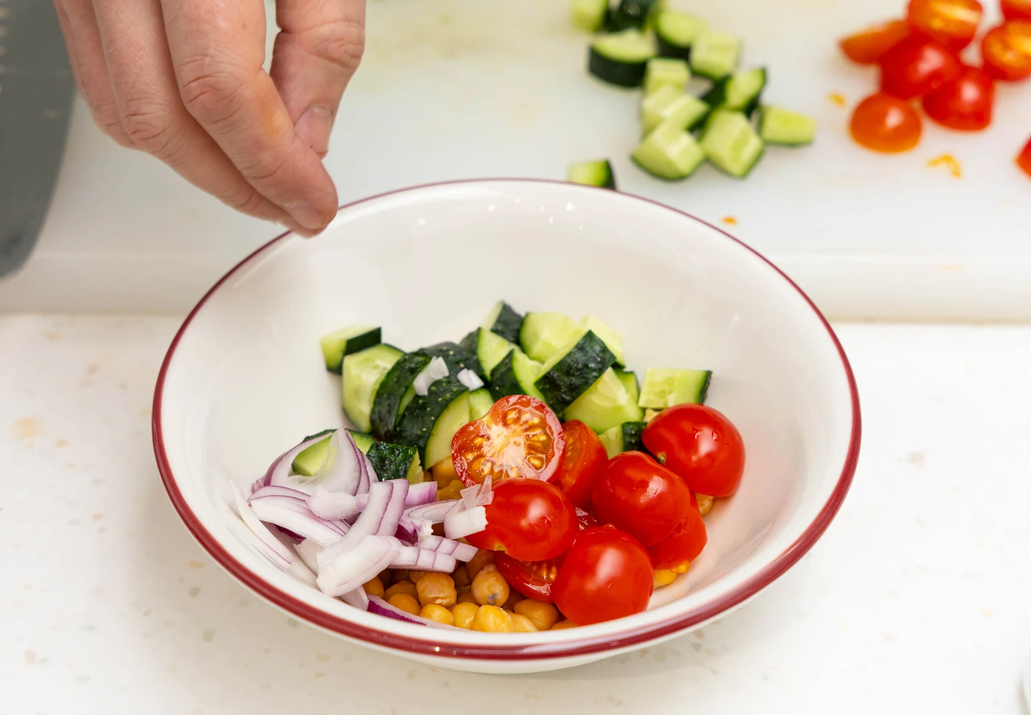 Нарежьте красный лук полукольцами, томаты черри — половинками, а огурец — небольшими кубиками.