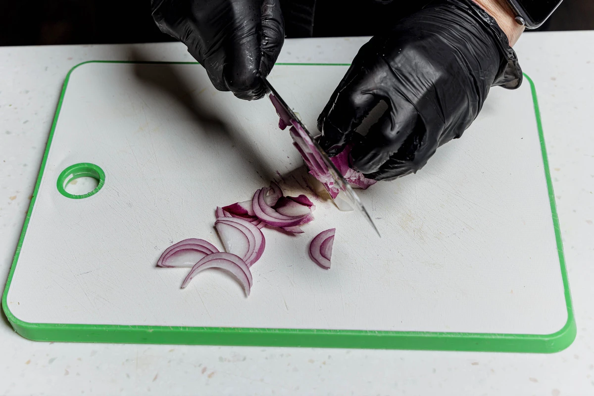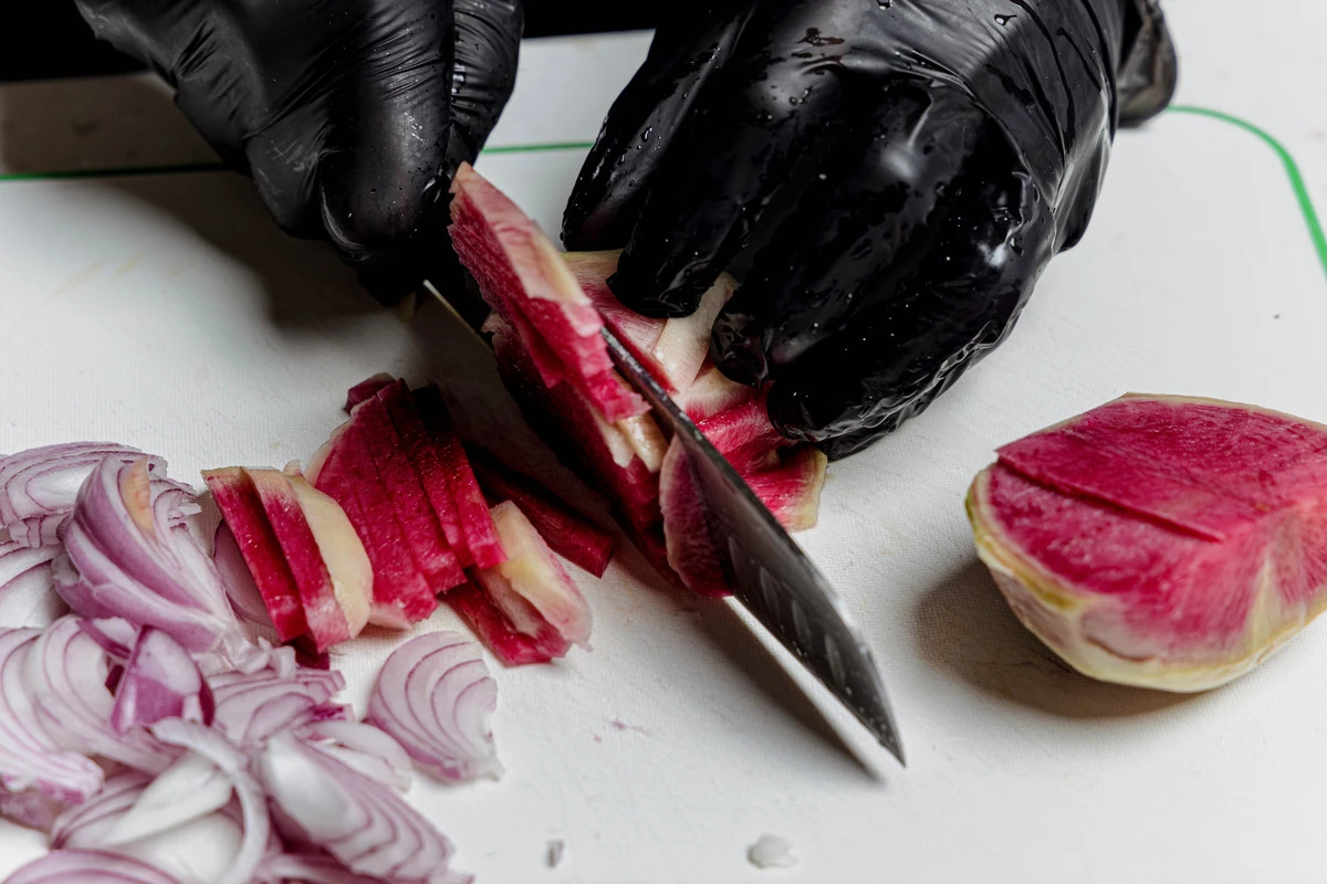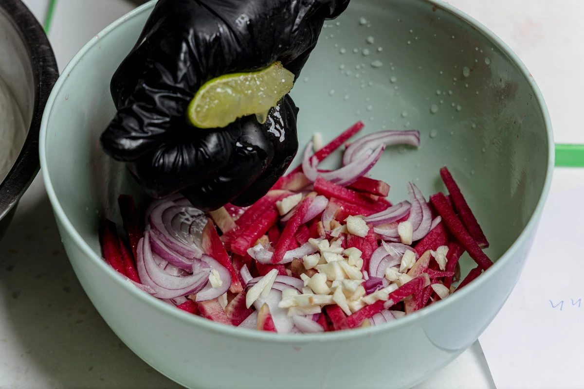 Соедините редьку, лук и чеснок, выдавите сок из половинки лайма, добавьте кунжутное масло и перемешайте.