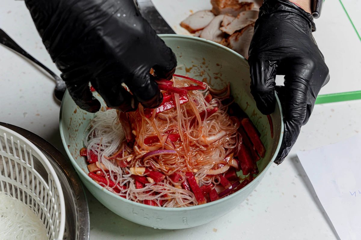 Салат с фунчозой — хорошее решение, когда не хочется готовить что-то сложное, а простые салаты надоели. Вместо арбузной редьки можно также взять дайкон или редиску. И кстати, если овощи быстро обжарить и прогреть с фунчозой, получится отличный вок.