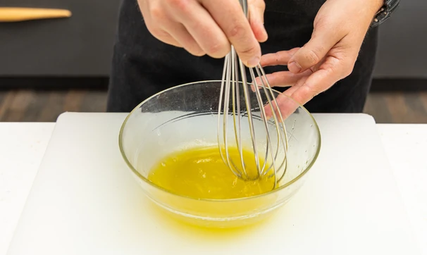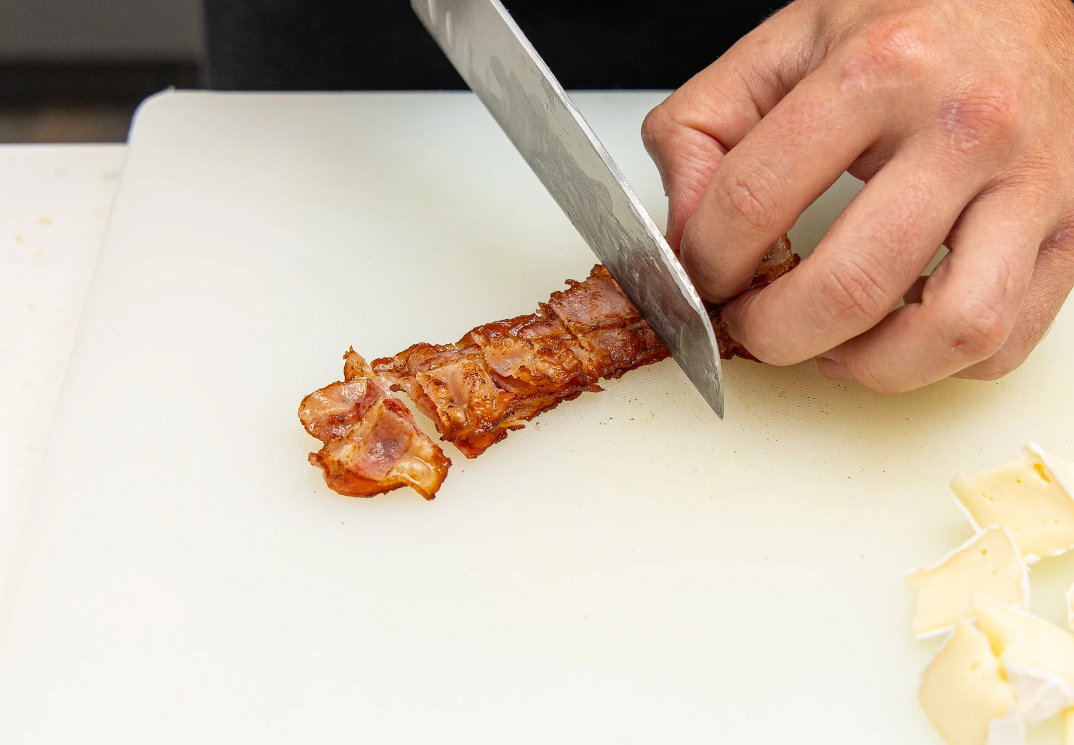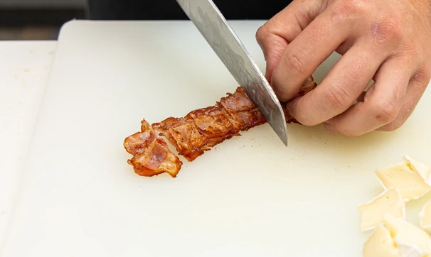 Бекон обжарьте до хрустящей корочки и порежьте кубиком 1,5 * 1,5 см.