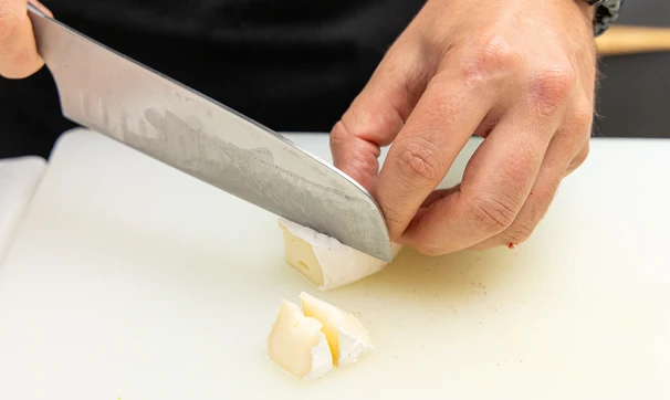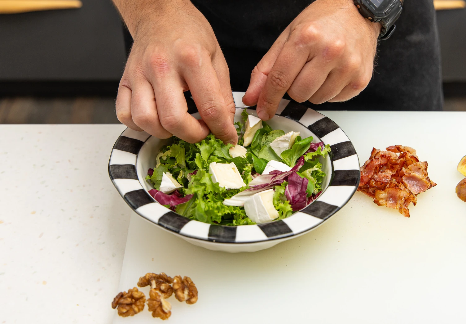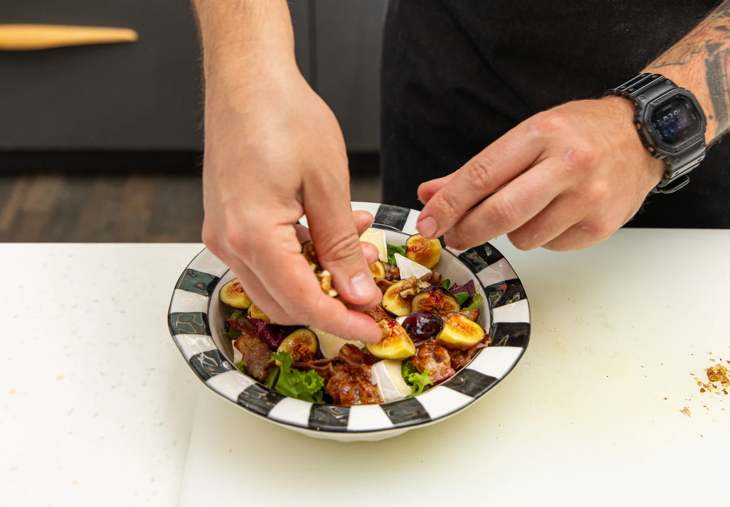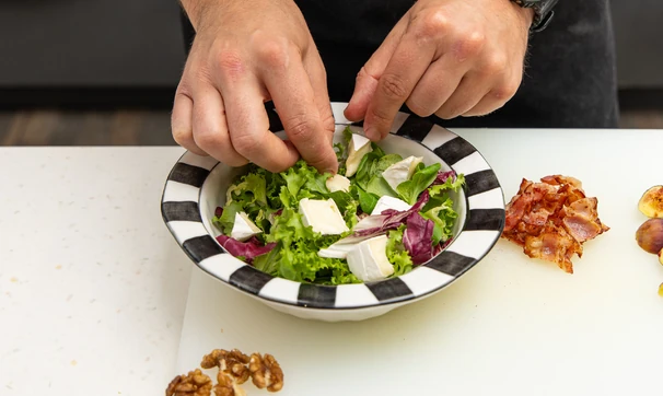 Инжир нарежьте на четвертинки, бри — тонкими ломтиками. Грецкие орехи порубите не слишком мелко.