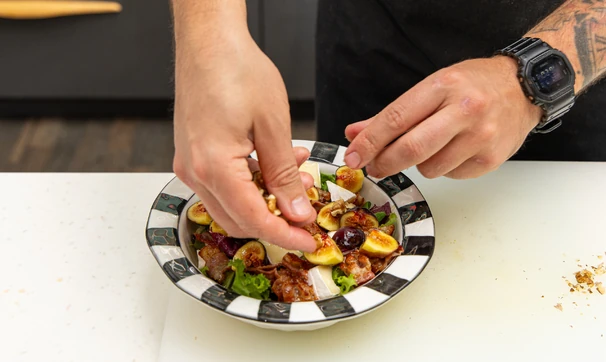 В тарелки выложите салатный микс, добавьте сыр, бекон, инжир.