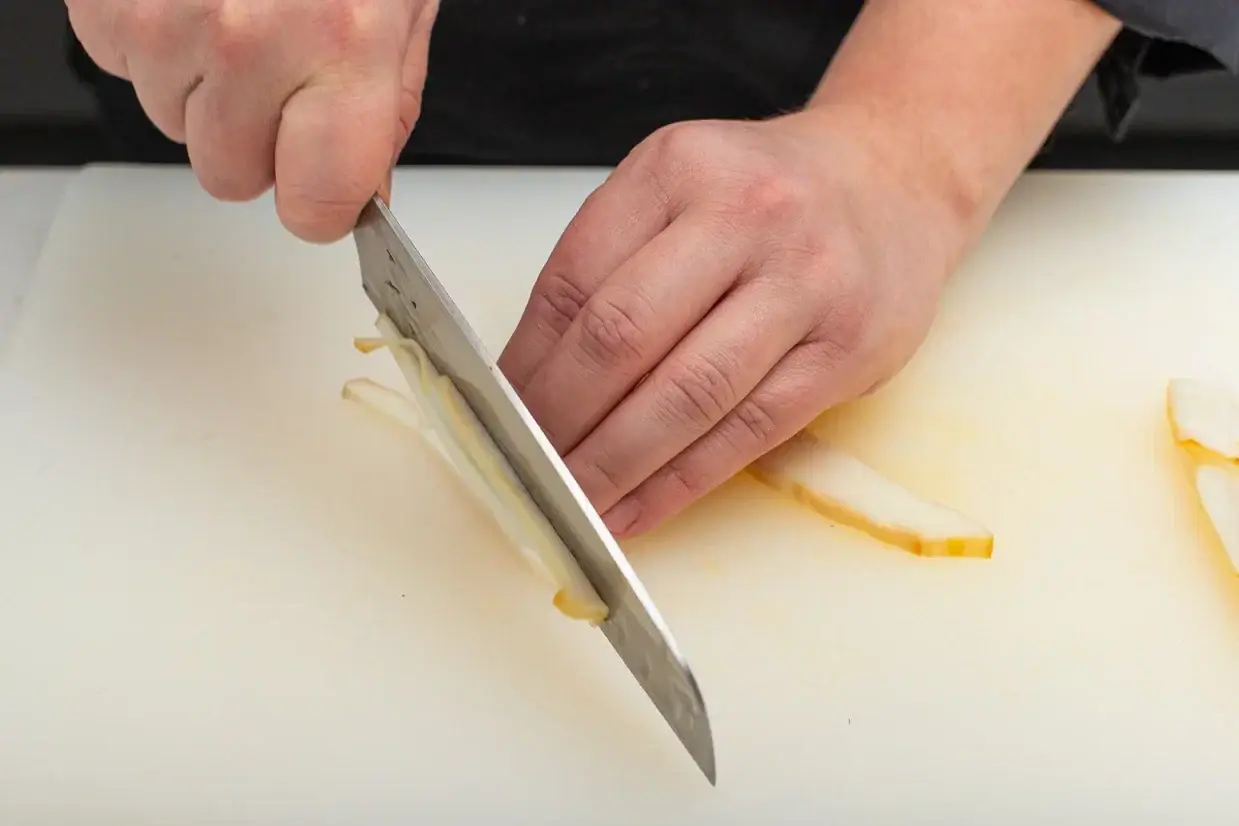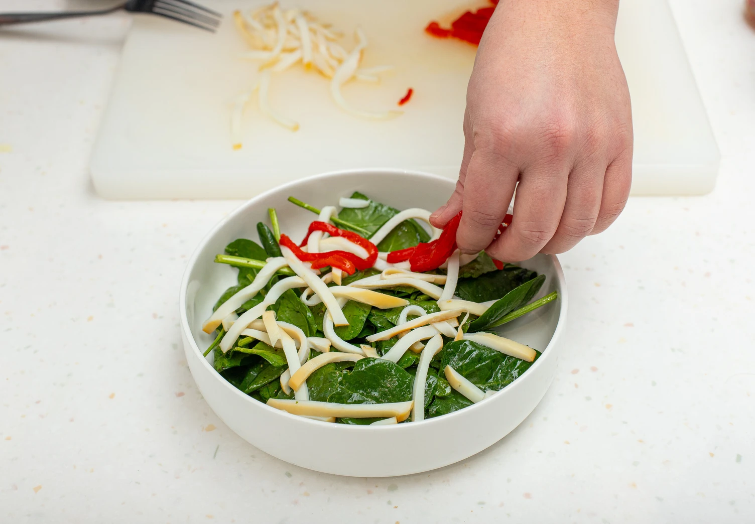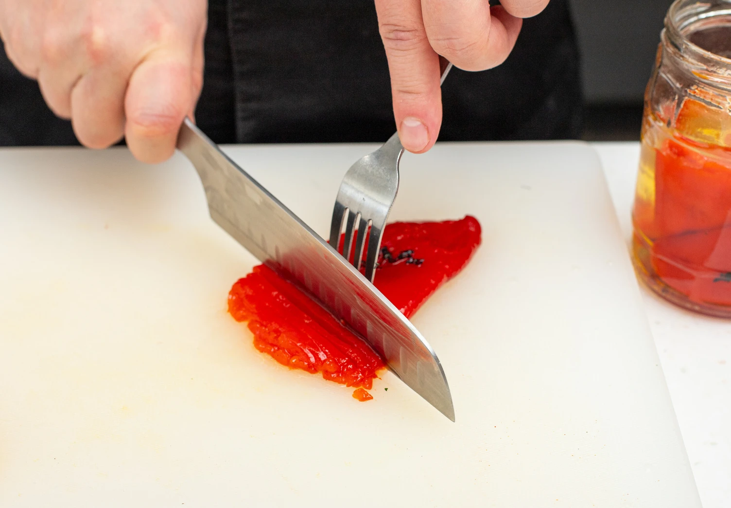 Нарежьте болгарский печёный перец тонкой соломкой.