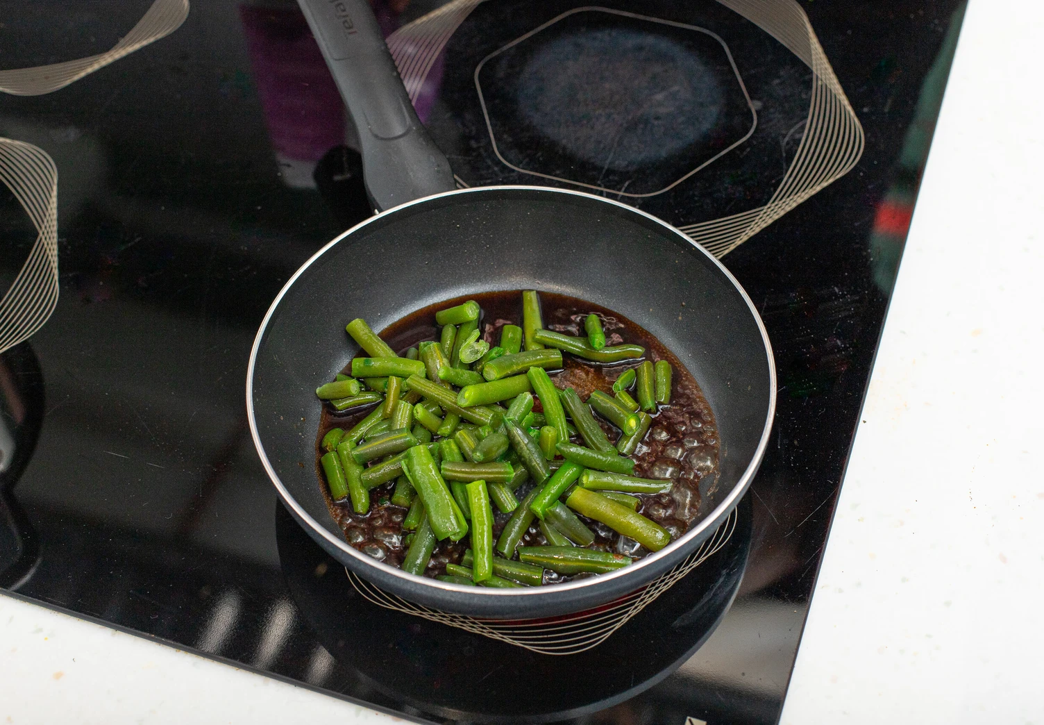 Бланшируйте фасоль в соевом соусе в течение 2–3 минут, затем остудите.