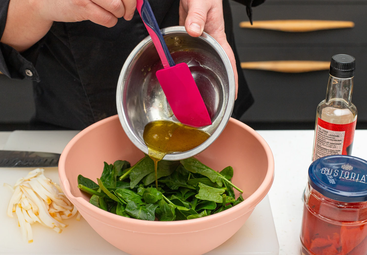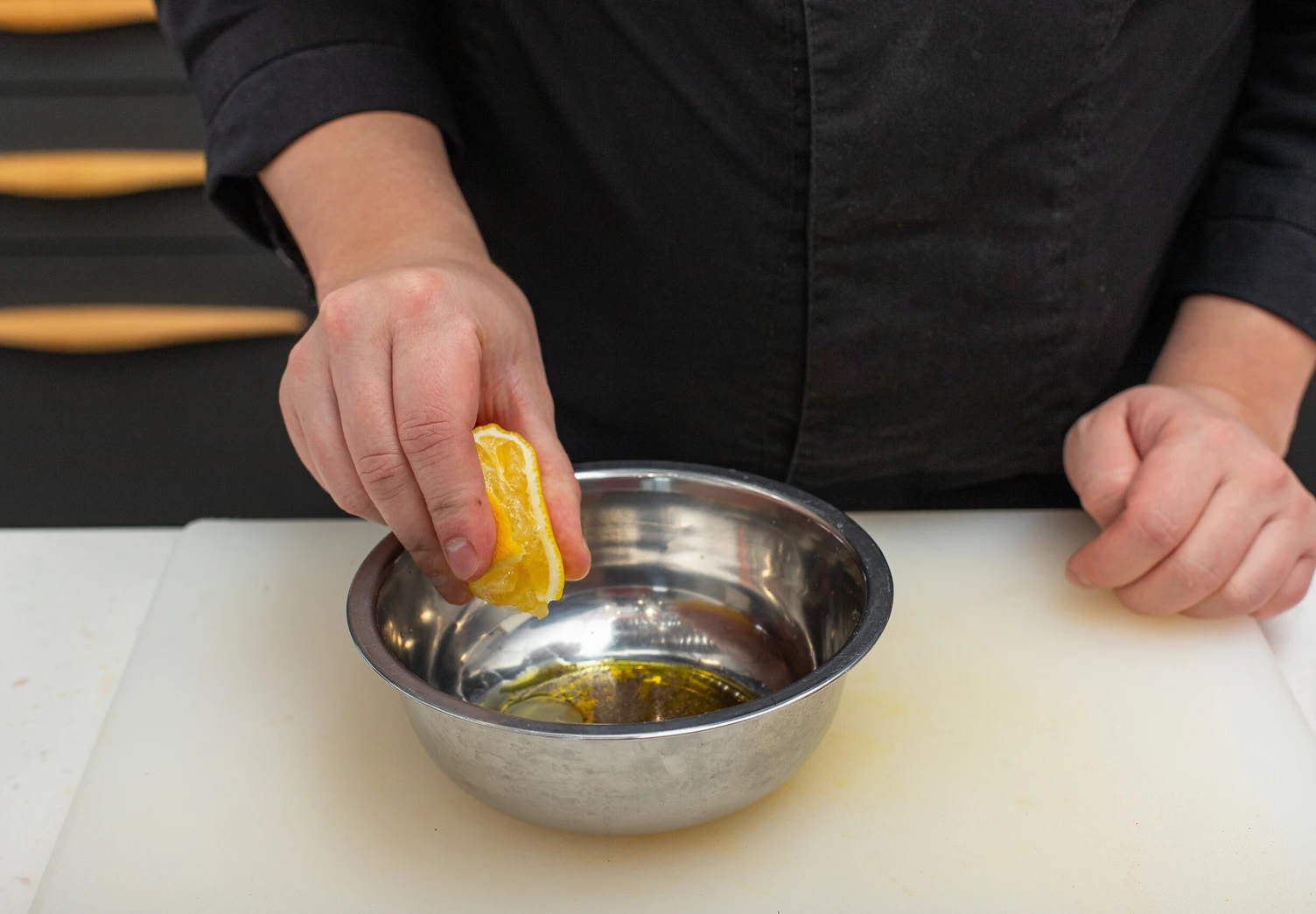 Смешайте сок лимона с маслом, чёрным перцем и солью — это будет заправка.