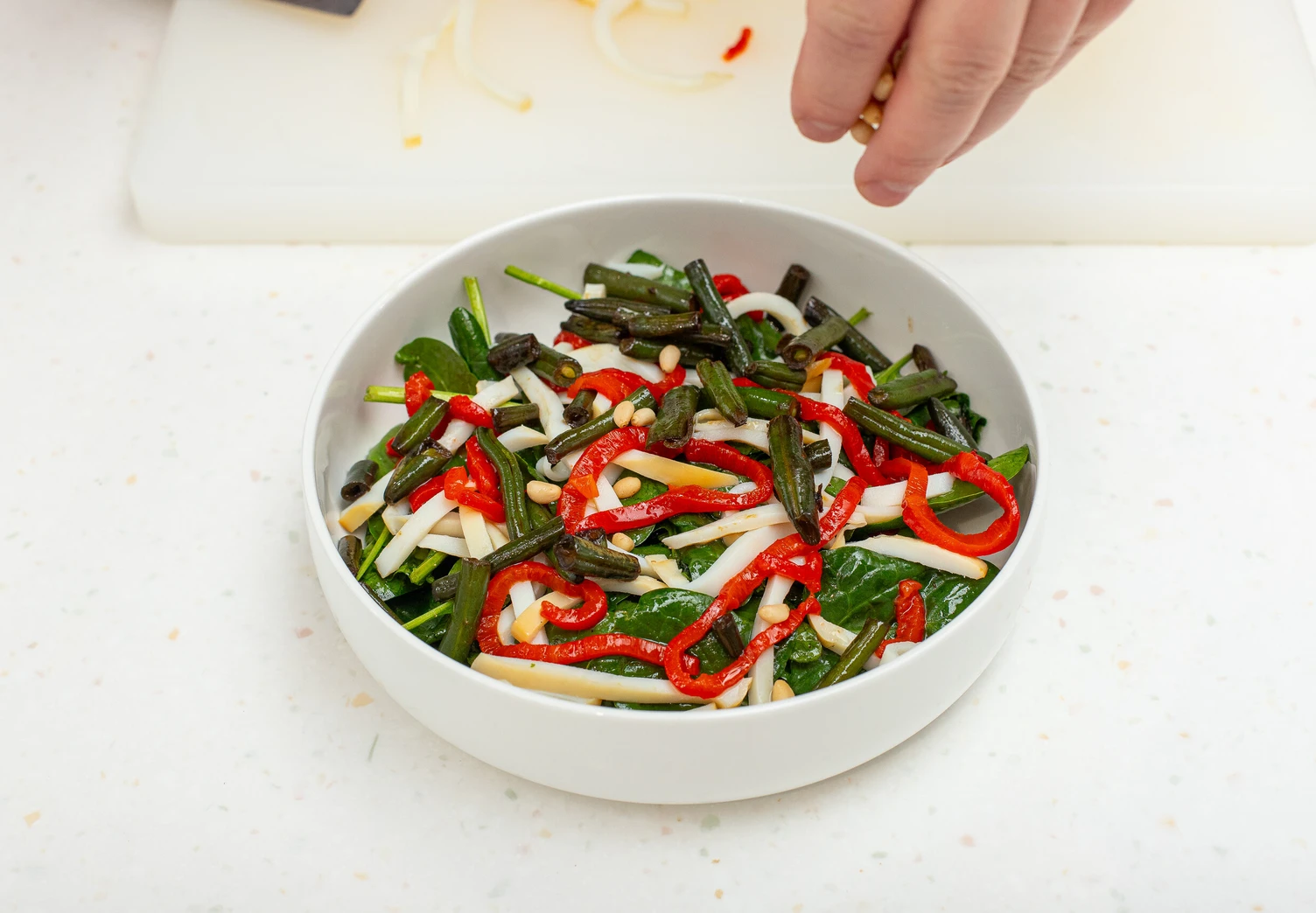 Сверху выложите смесь из кальмаров, фасоли и болгарского перца.