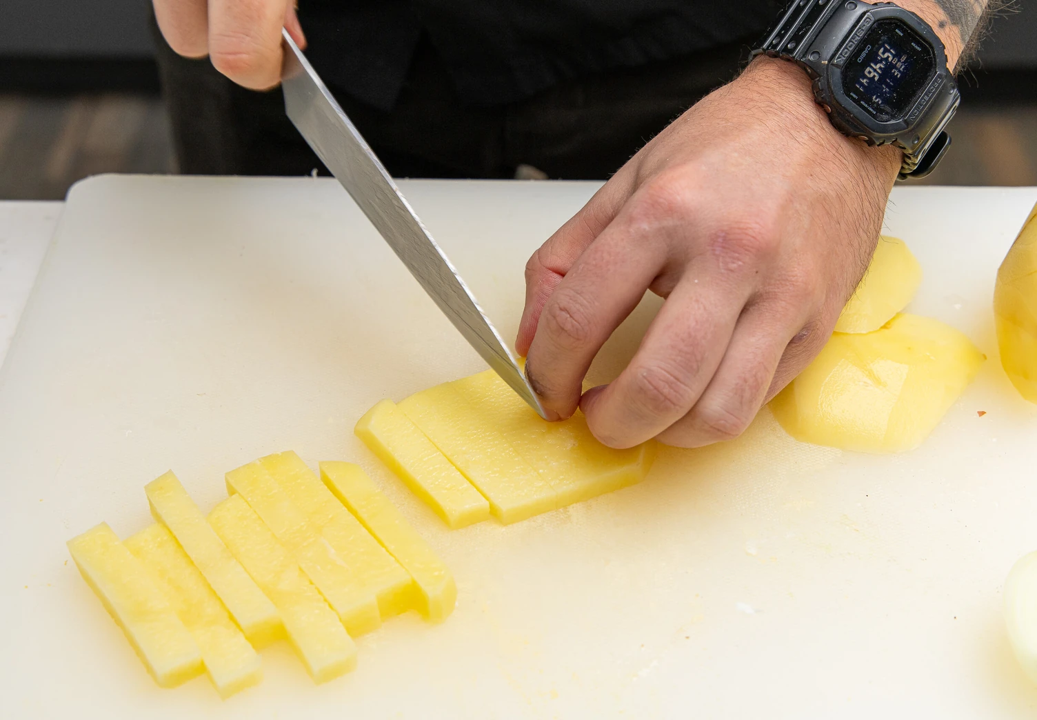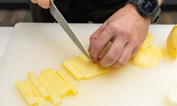 Болгарский перец и очищенный картофель нарежьте брусочками.