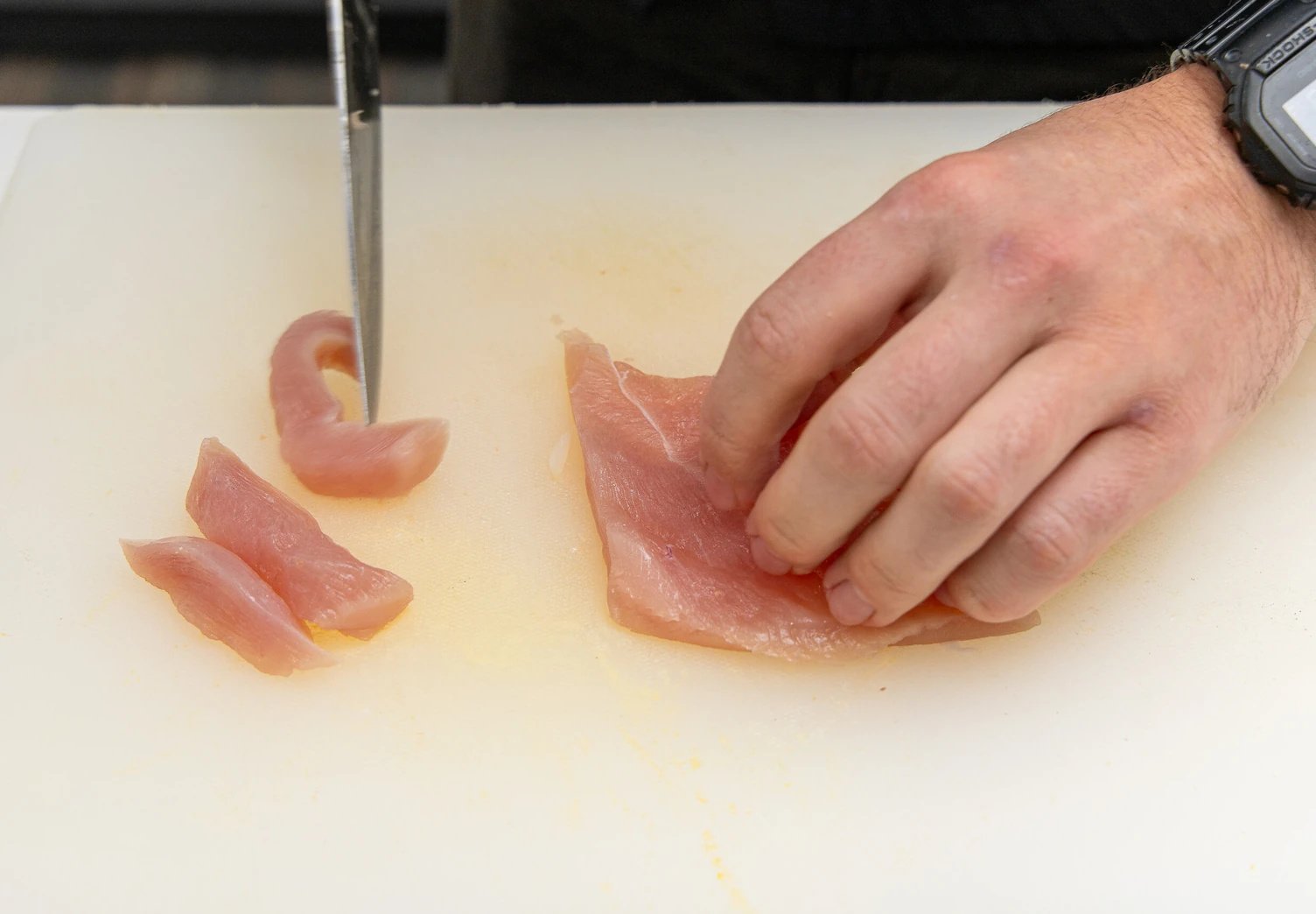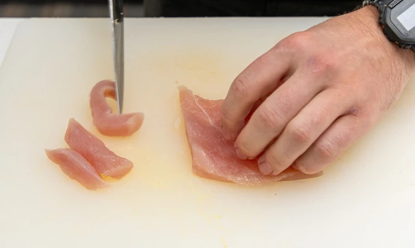 Нарежьте куриное филе на стрипсы.