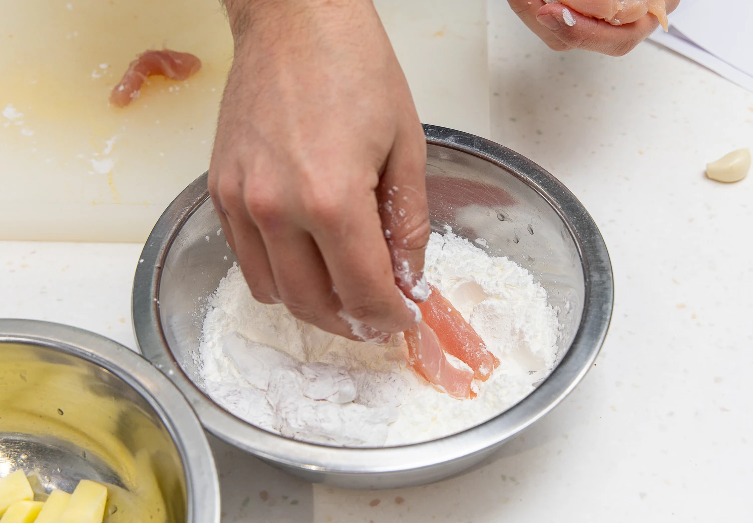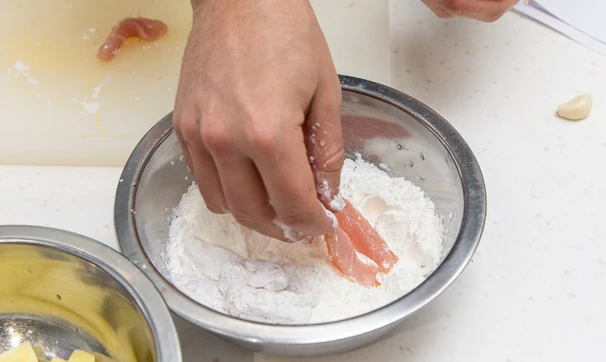 В миску с крахмалом поместите курицу и картофель и хорошо обваляйте их.