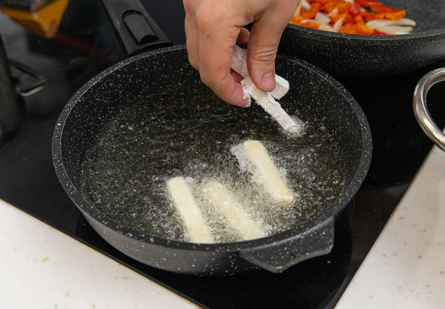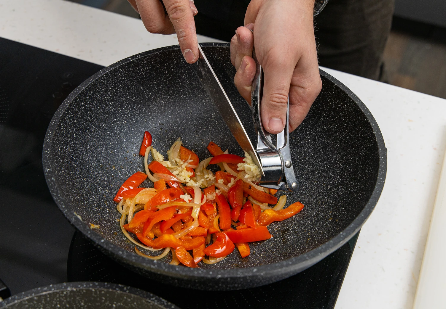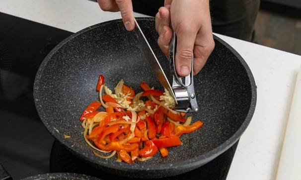 На отдельной сковороде обжарьте лук и болгарский перец в небольшом количестве масла 3–4 минуты. В конце добавьте чеснок.