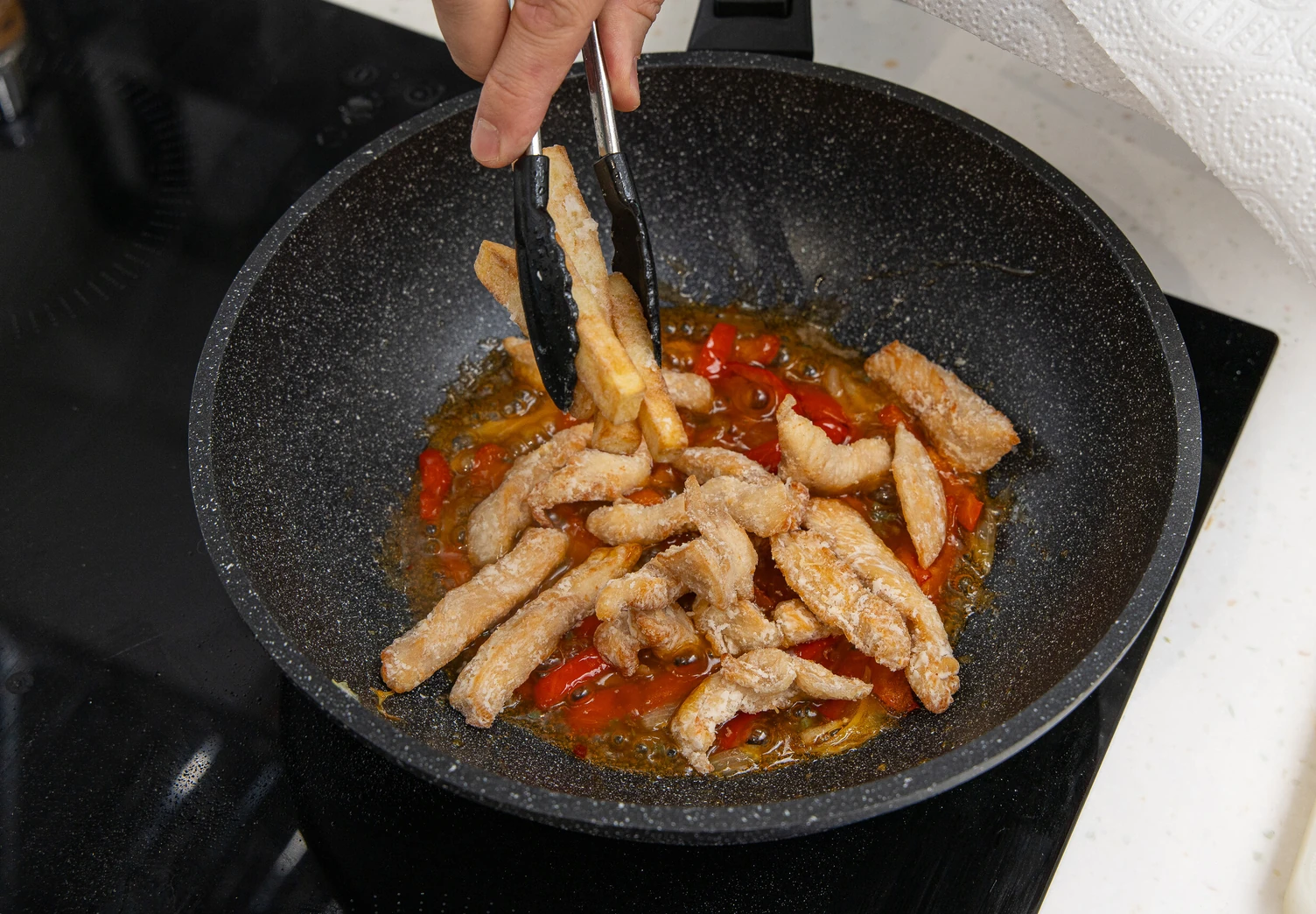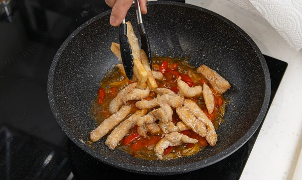 Убавьте огонь до минимума (или снимите сковороду с плиты, если она долго остывает) и влейте кисло-сладкий соус. Дайте ему слегка закипеть.