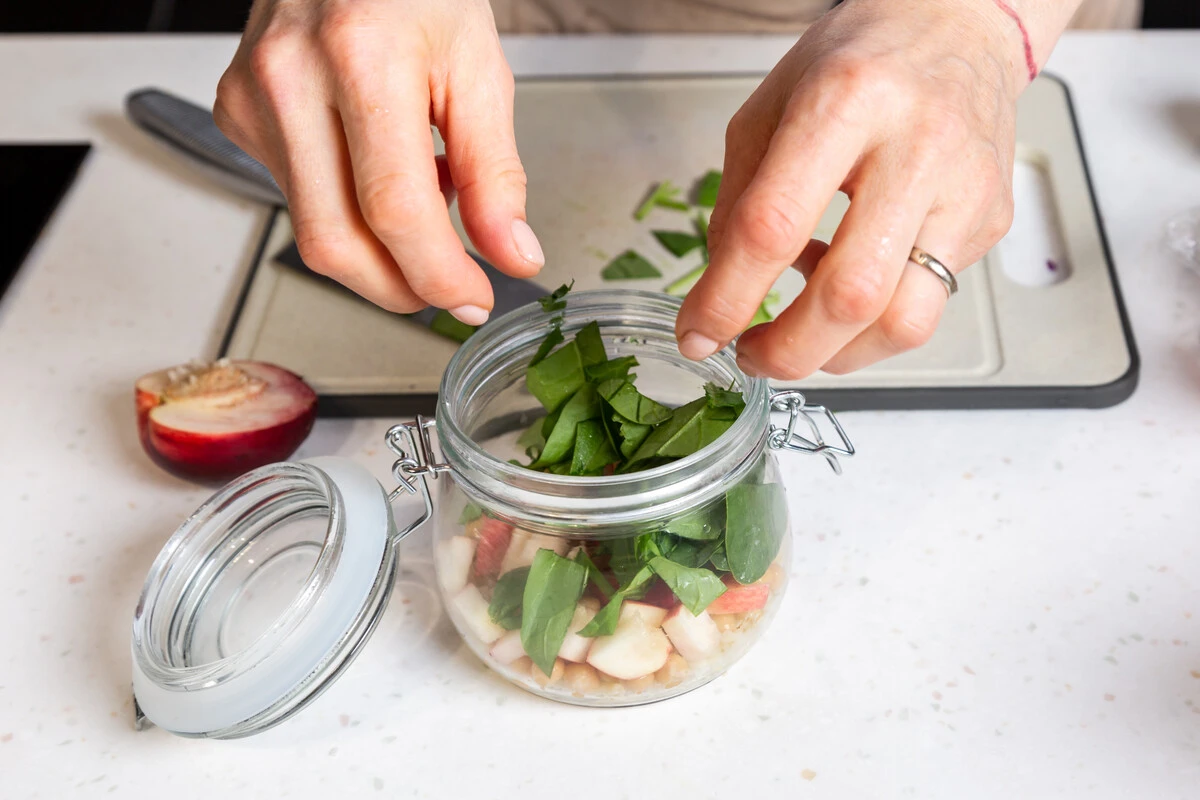 Нектарины нарежьте кубиками, добавьте половину в банку поверх нута. Помимо нектаринов можете также взять персики или инжир.
