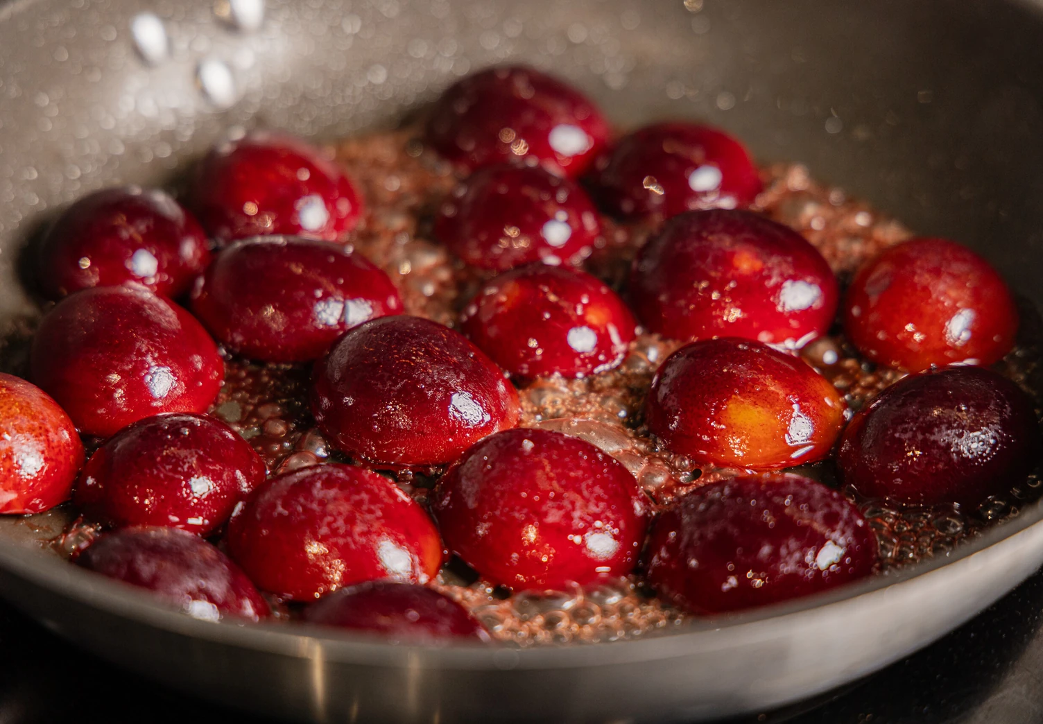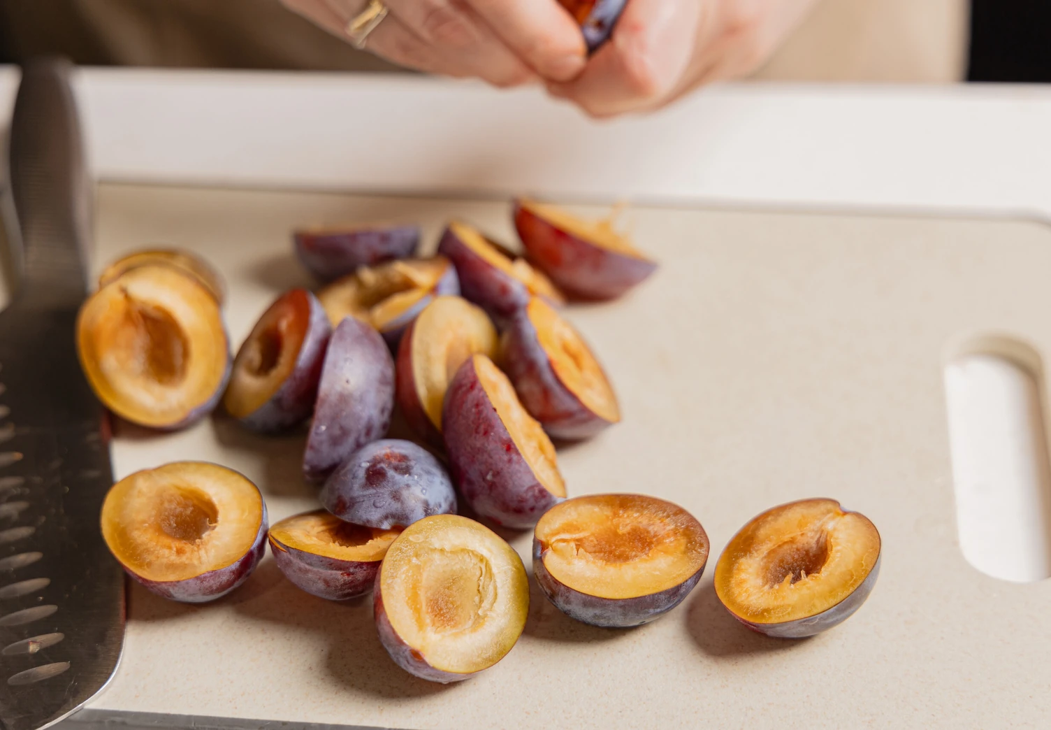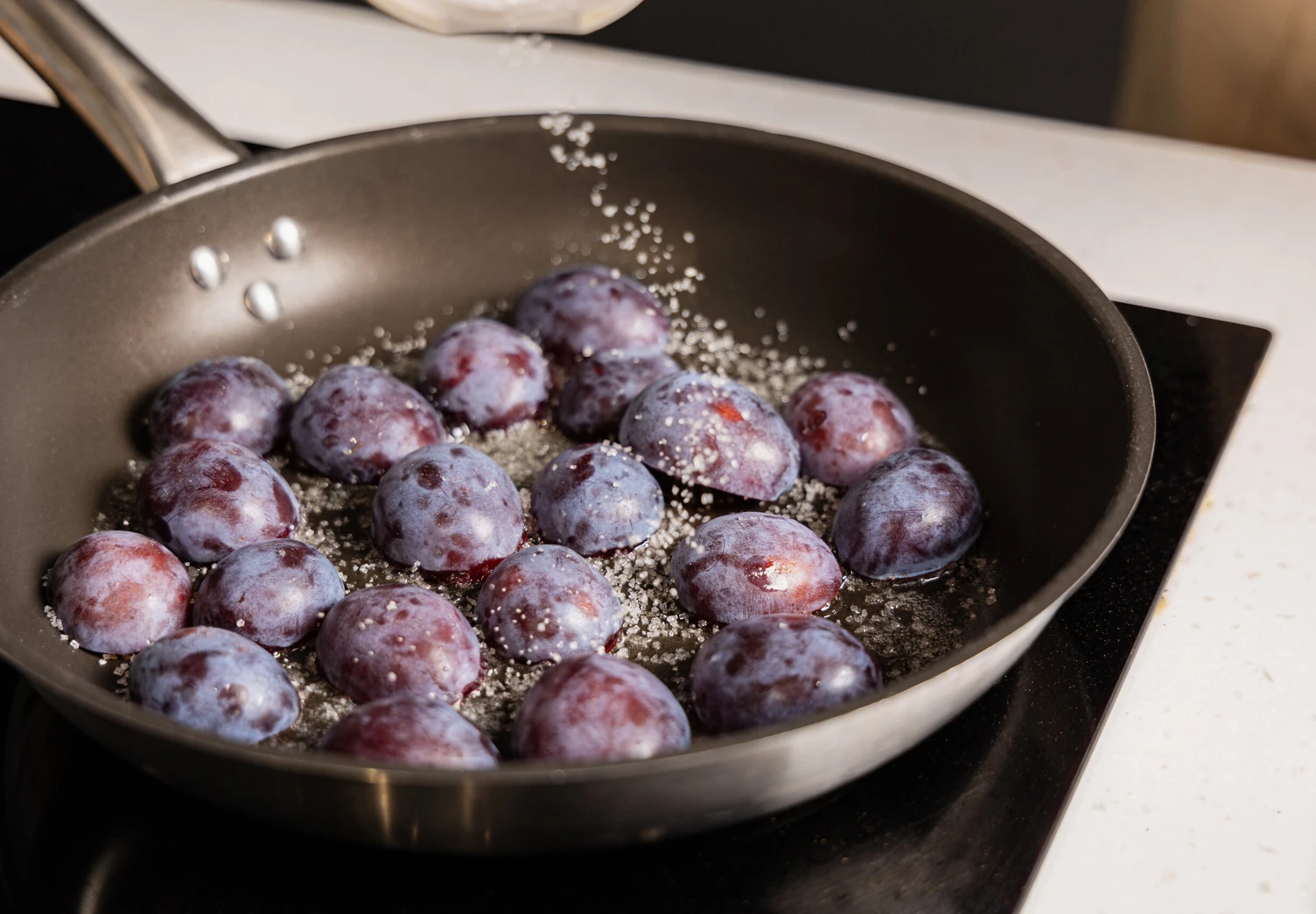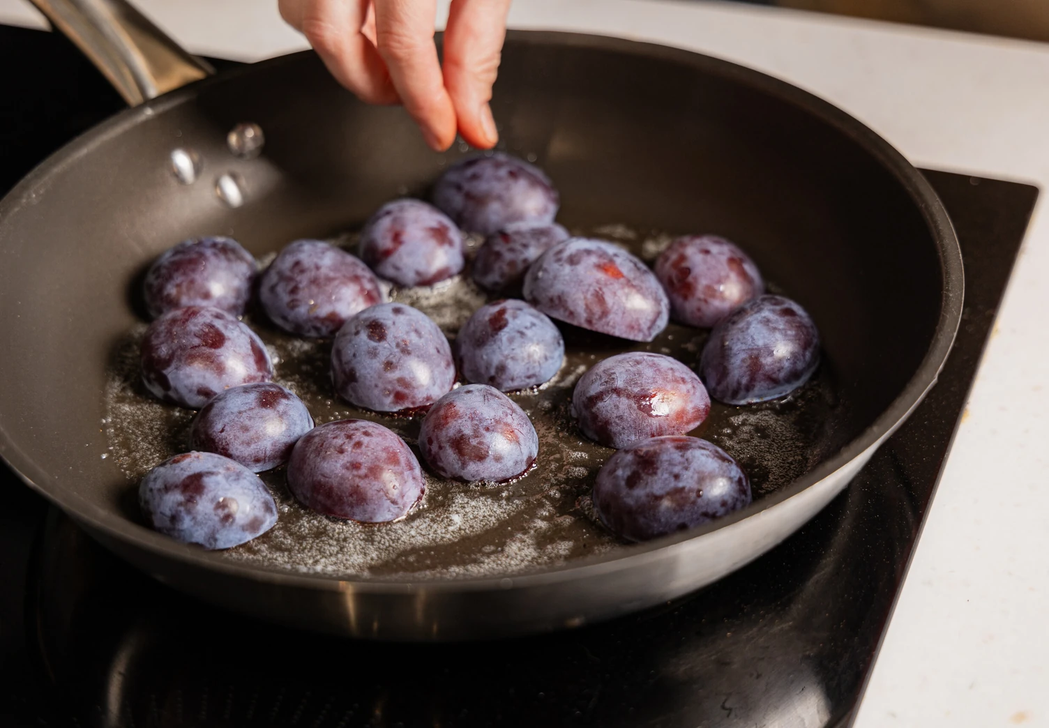 Растопите на сковороде сливочное масло и выложите половинки слив кожицей вверх.