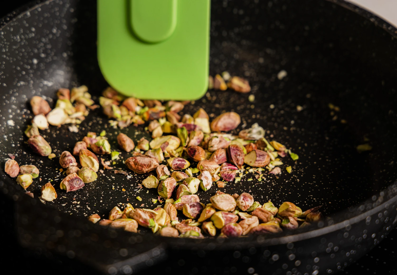Фисташки мелко порубите и обжарьте на сухой сковороде.