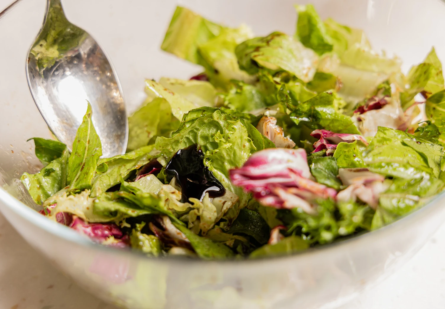 Микс салатов заправьте оливковым маслом и бальзамическим уксусом, посолите и поперчите по вкусу.
