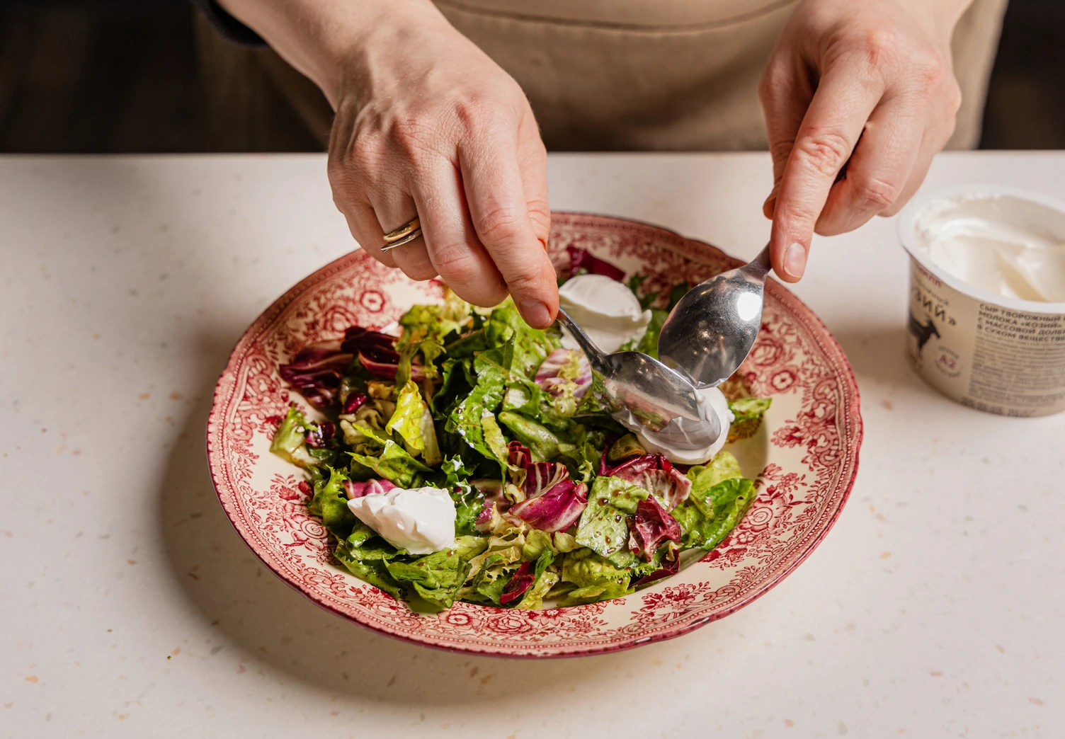 С помощью чайной ложки выложите на листья салата творожный сыр.
