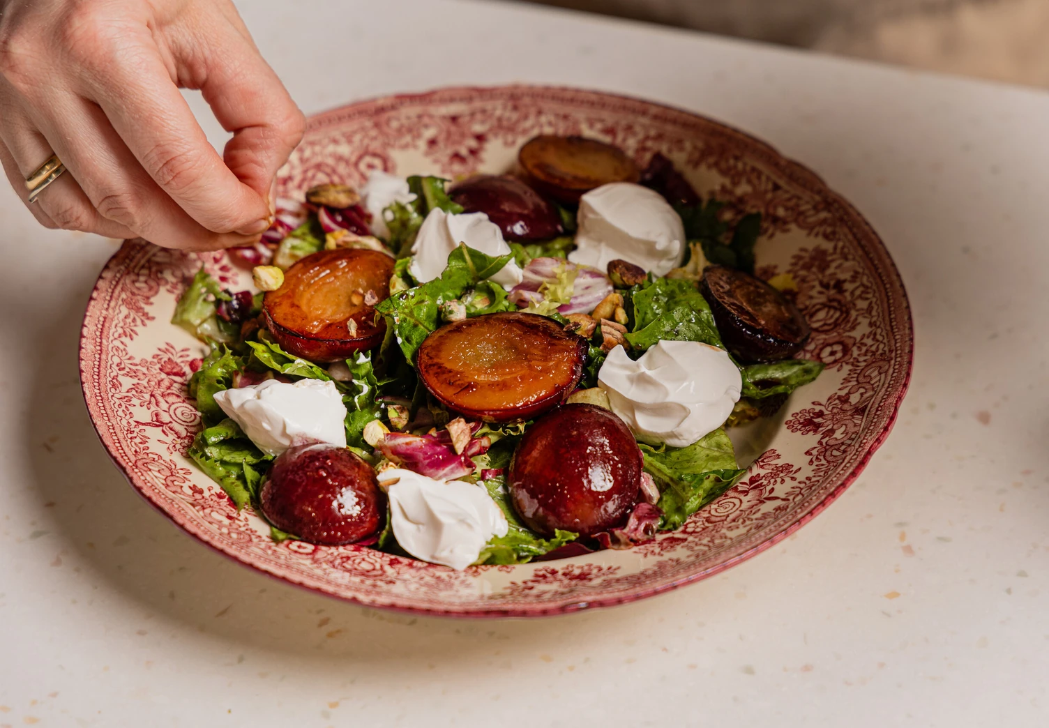 Этот салат — идеальный баланс вкусов и текстур. Сладкие карамелизированные сливы создают гармоничный контраст с пикантным козьим сыром и свежей зеленью. А если захочется разнообразия, смело заменяйте сливы персиками, нектаринами или хурмой.