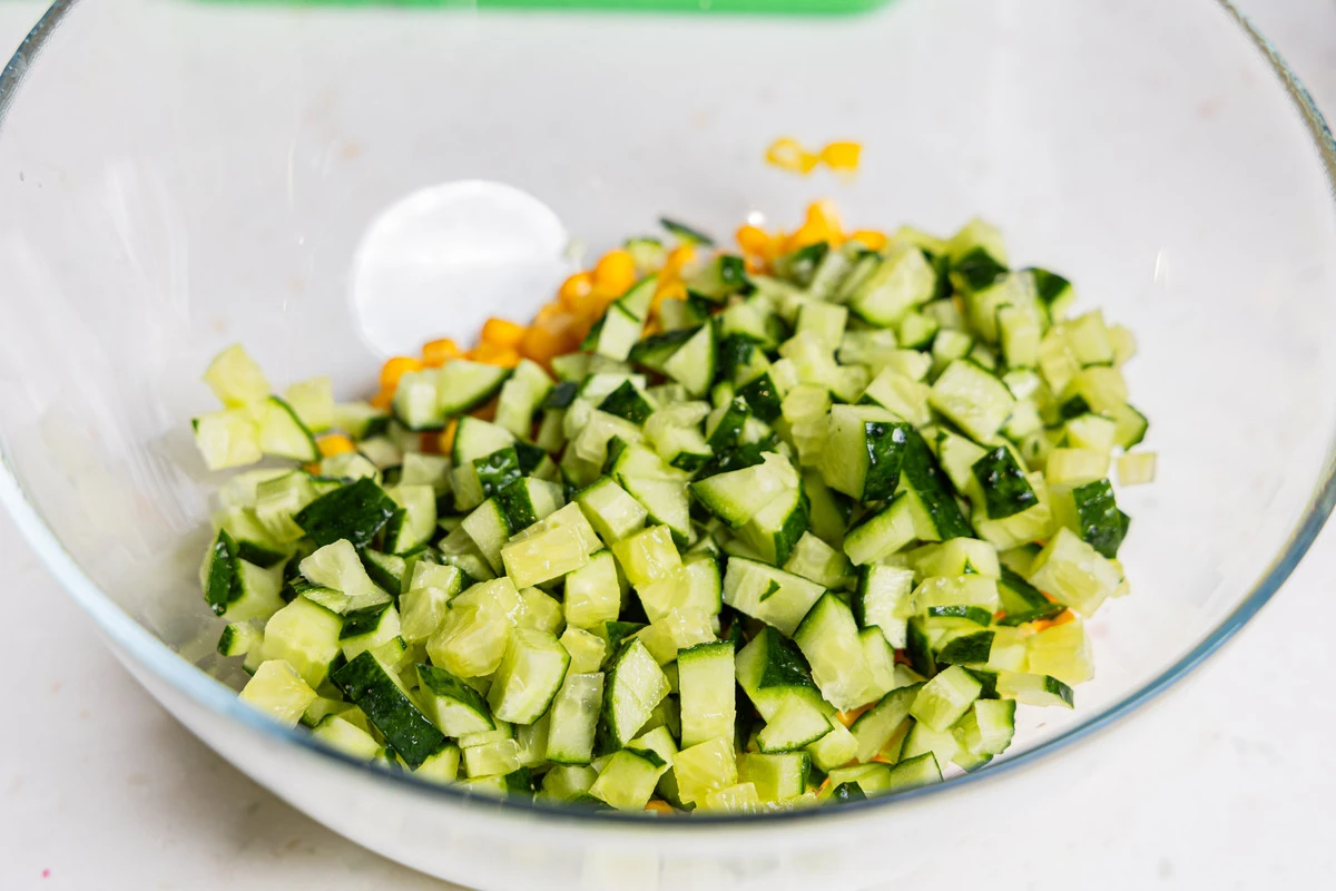 Из баночки с кукурузой слейте воду. Огурцы помойте, отрежьте плодоножки и нарежьте овощи кубиками. Выложите огурцы с кукурузой в миску.