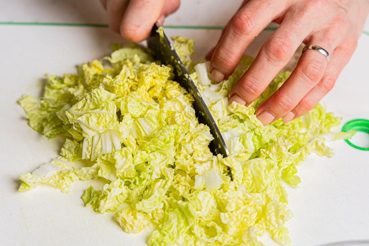 Пекинскую капусту помойте и нашинкуйте.