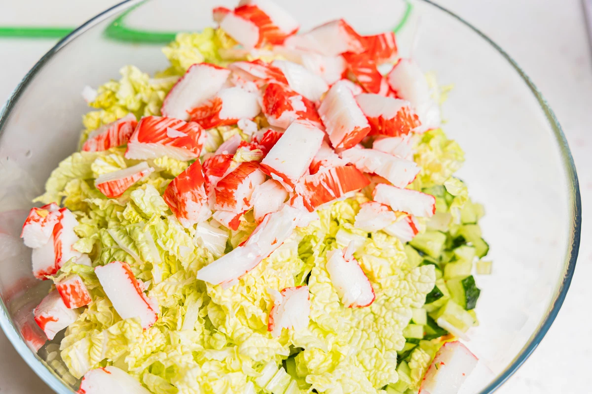 Крабовые палочки нарежьте кусочками среднего размера и добавьте в миску вместе с пекинской капустой.