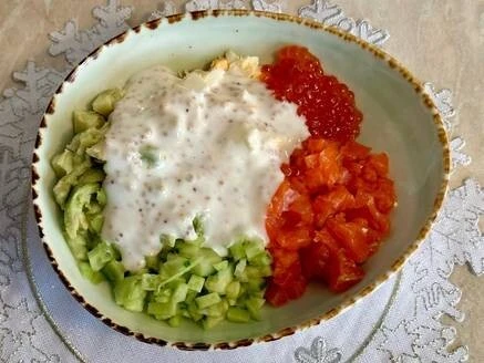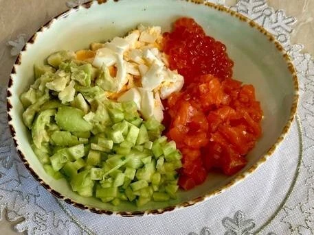 Нарежьте авокадо, рыбу, огурец и яйца кубиками. Выложите икру и отправьте в подходящую ёмкость.