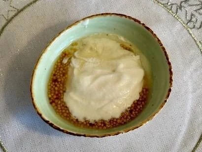 Смешайте греческий йогурт, мёд и горчицу. Добавьте по вкусу сок лимона и посолите.