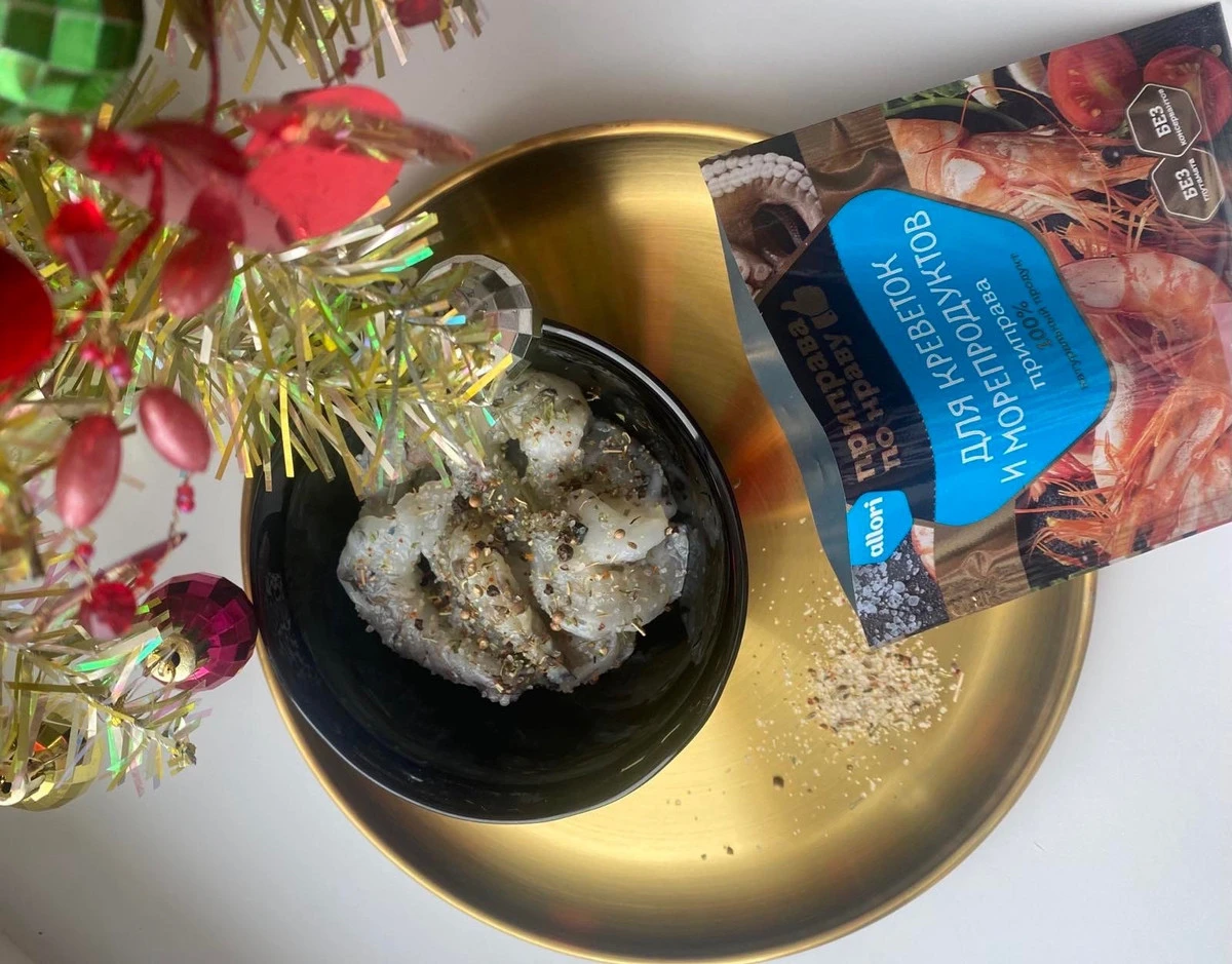 Очищенные и размороженные креветки переложите в миску, добавьте приправу и оставьте на 10 минут мариноваться.