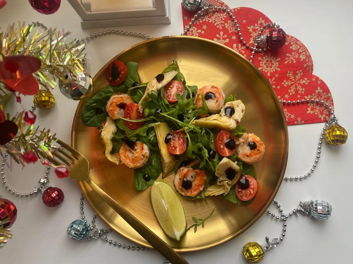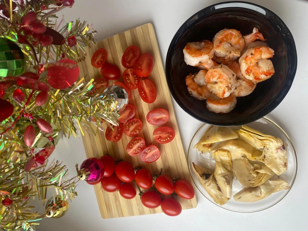 Разрежьте помидоры черри пополам, выложите микс салата, креветки и артишоки.