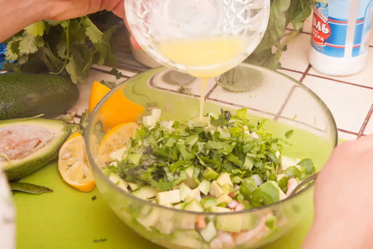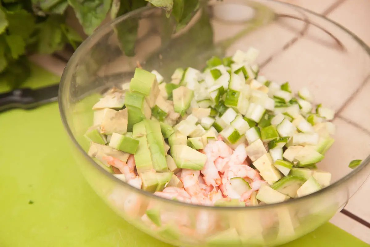 Размороженные креветки очистите, авокадо и огурец нарежьте кубиками, листья пекинской капусты порубите (только мягкую часть), все смешайте, добавьте порубленную кинзу.