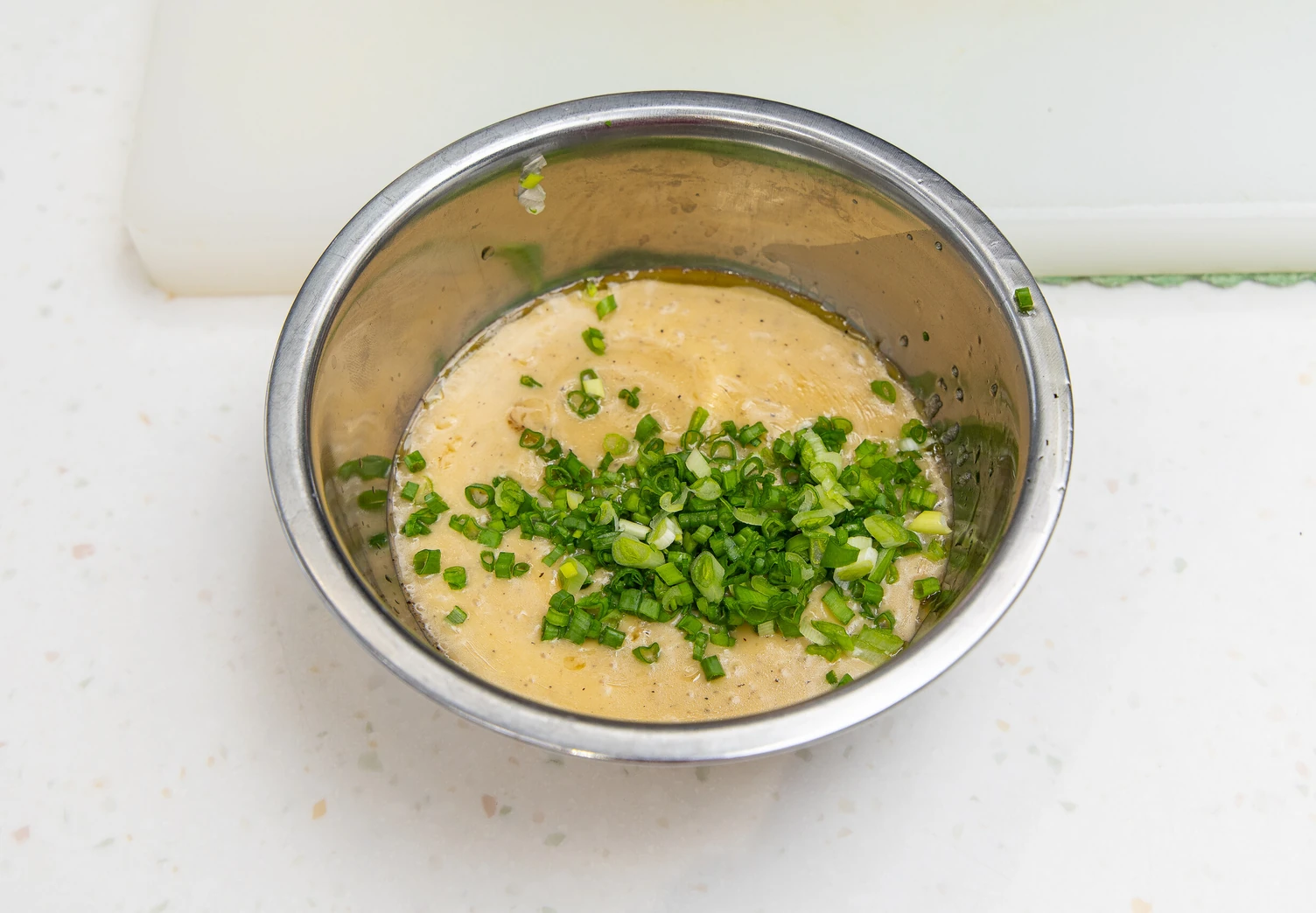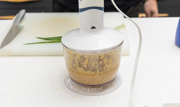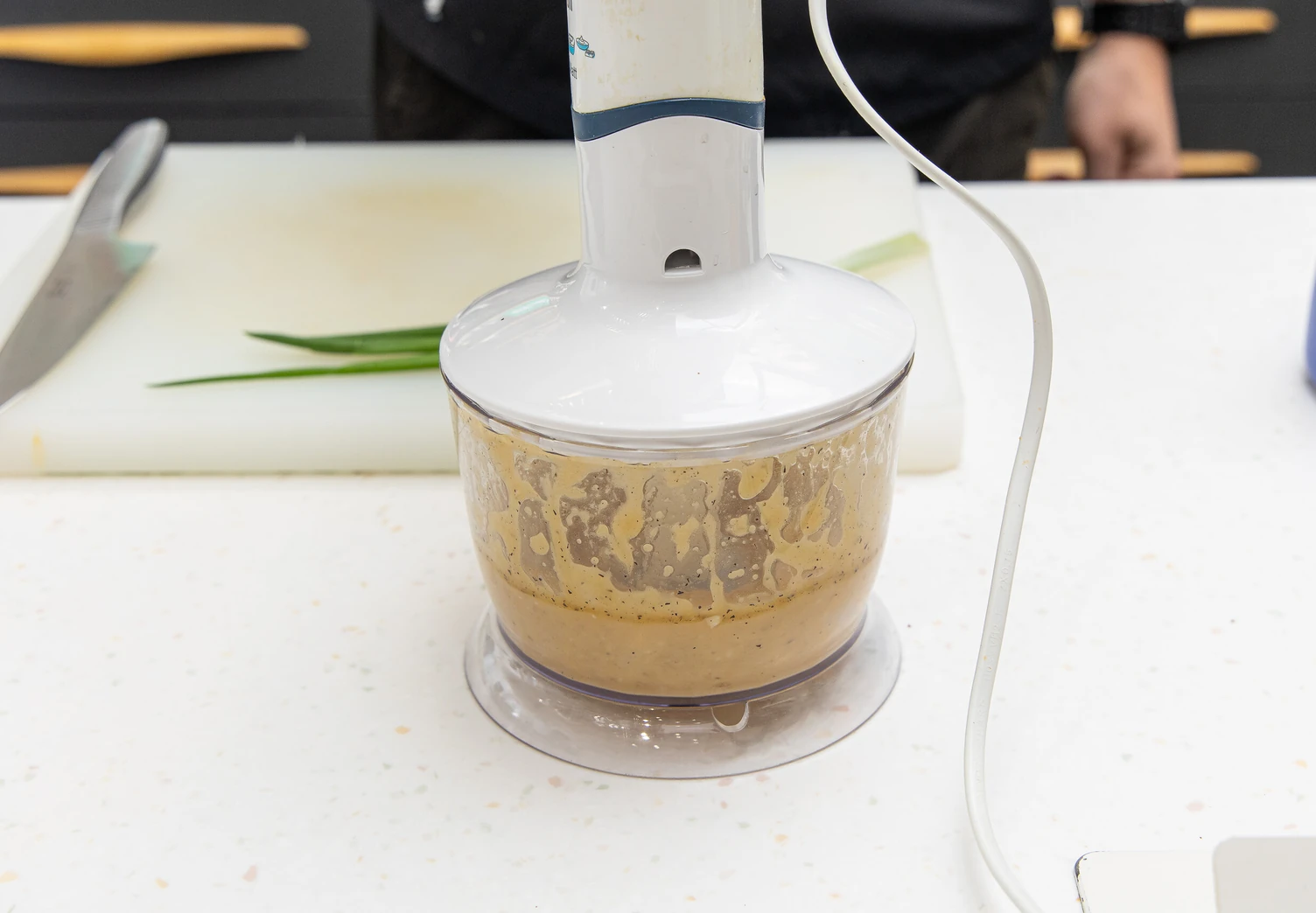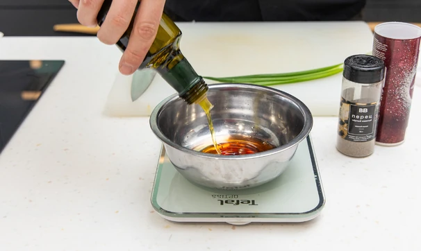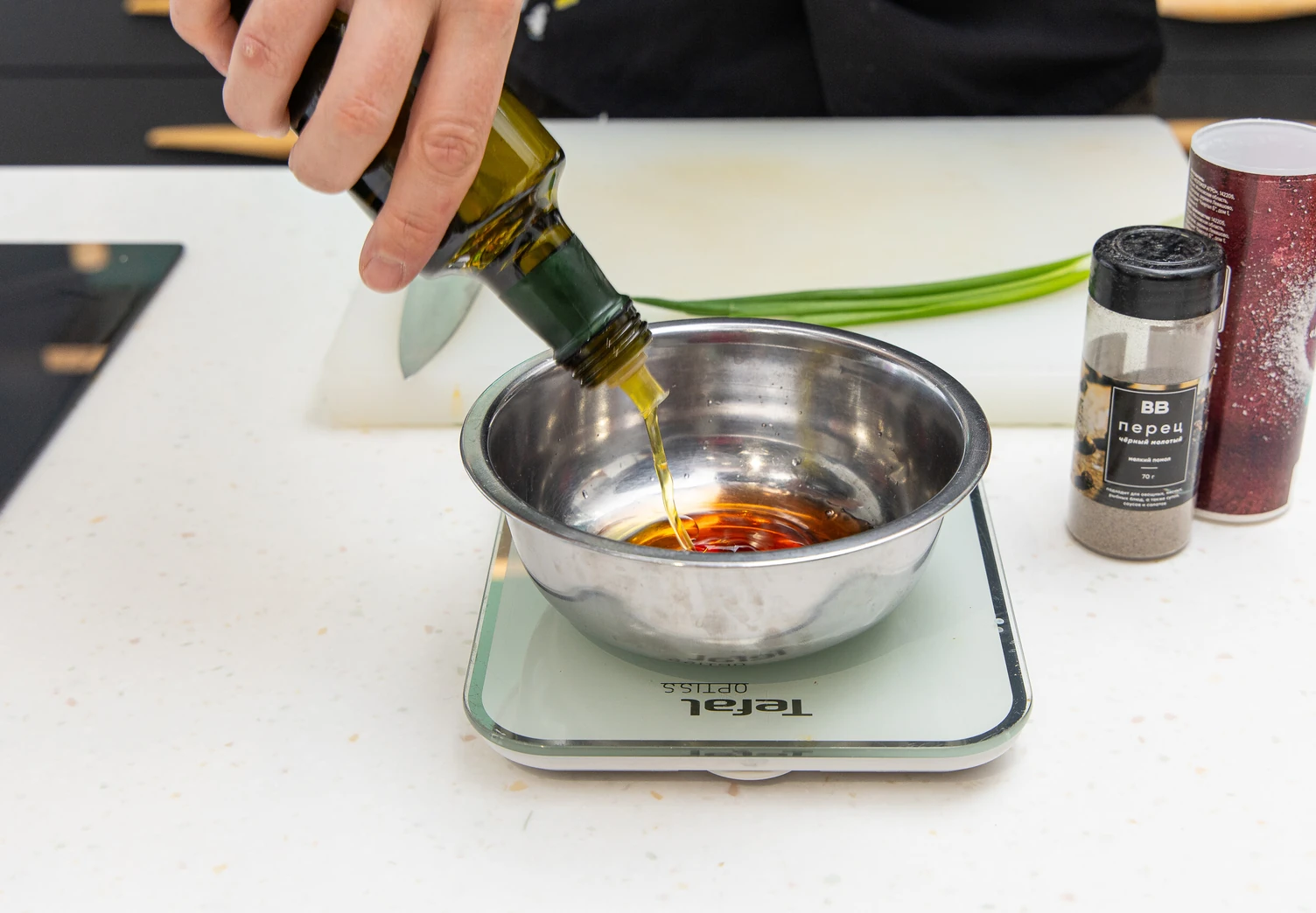 Сделайте заправку, соединив в небольшой миске или банке оливковое масло, красный винный уксус, тёртый чеснок, соль и молотый чёрный перец.