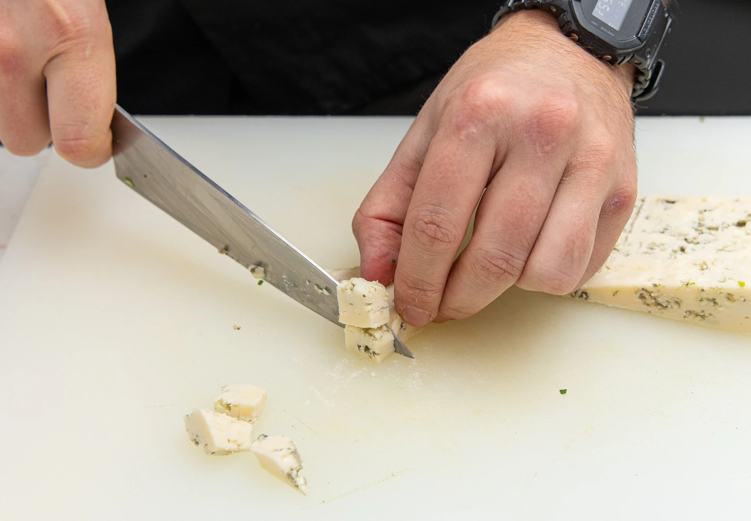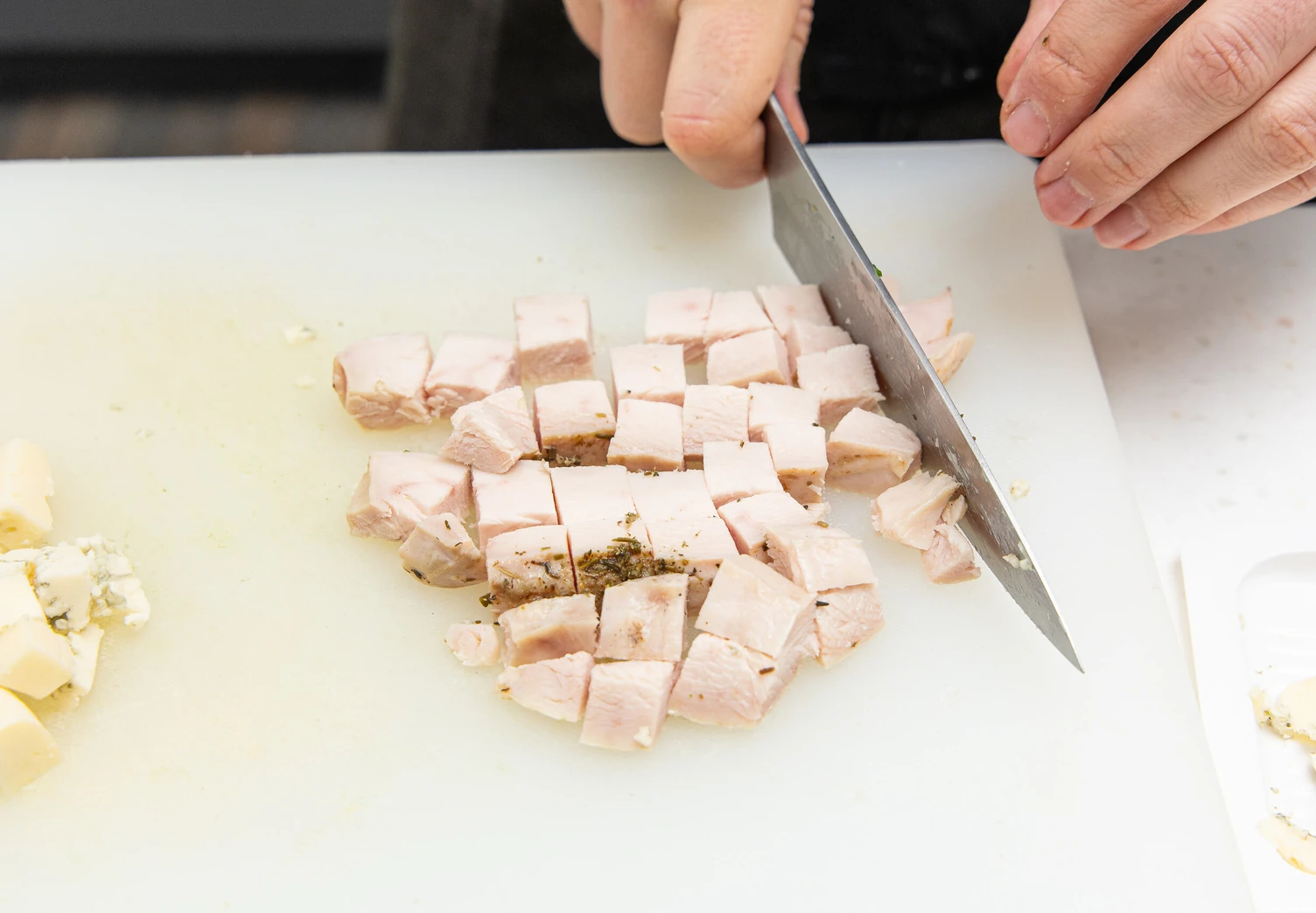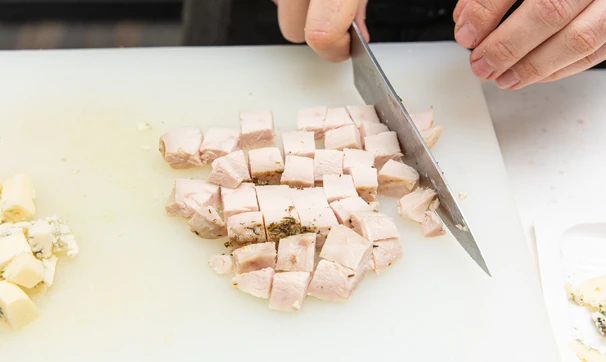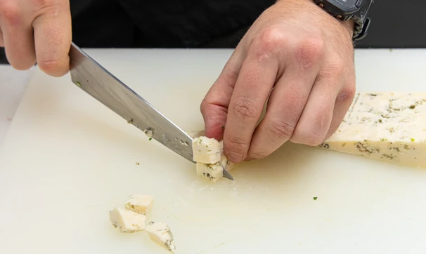 В этом салате прекрасно всё: сочное куриное филе, пикантный сыр с благородной плесенью, сладкие апельсины и хрустящая зелень. Лайфхак: листья романо лучше рвать руками, а не резать — так они не потемнеют.