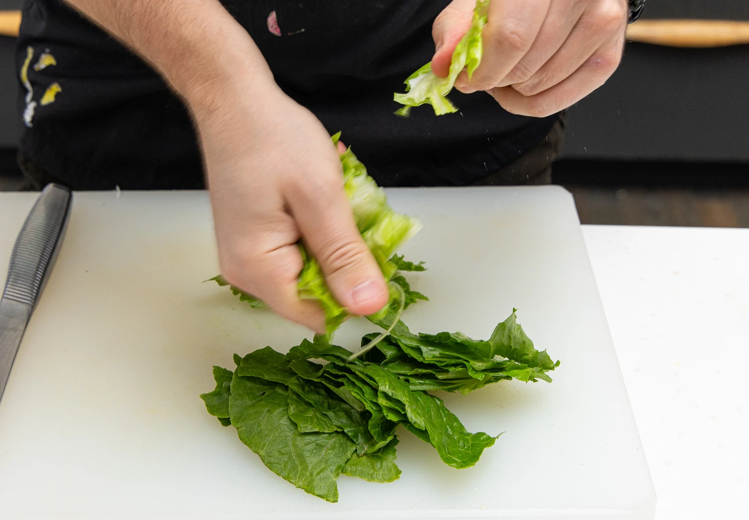 Листья салата порвите руками на кусочки размером 2–3 см.