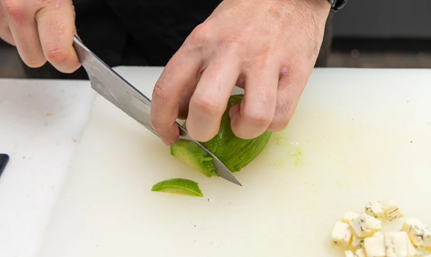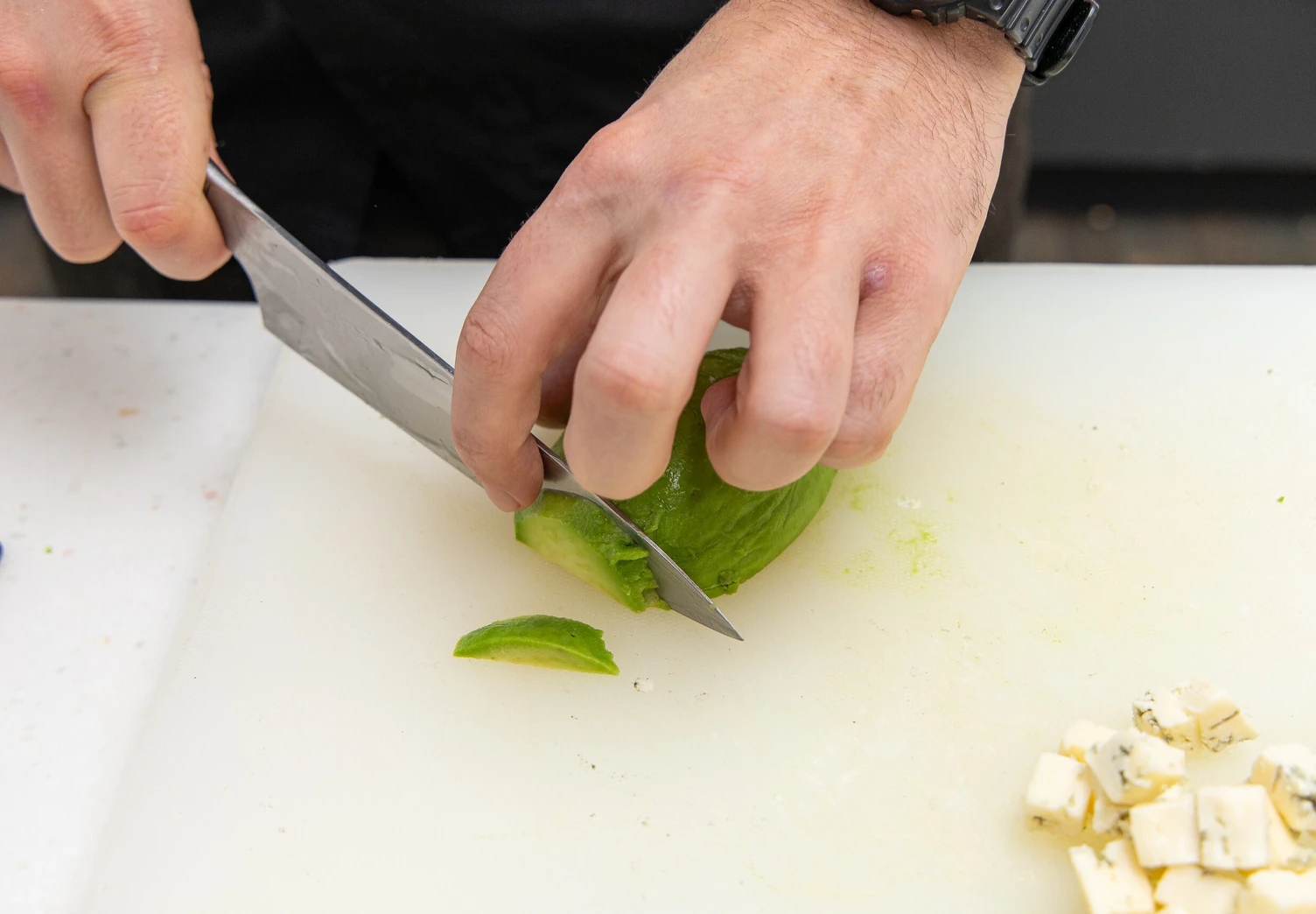 Непосредственно перед сборкой салата нарежьте авокадо ломтиками.