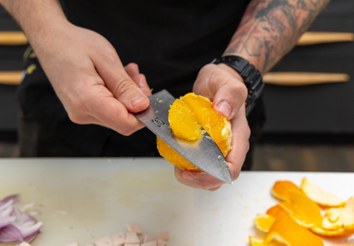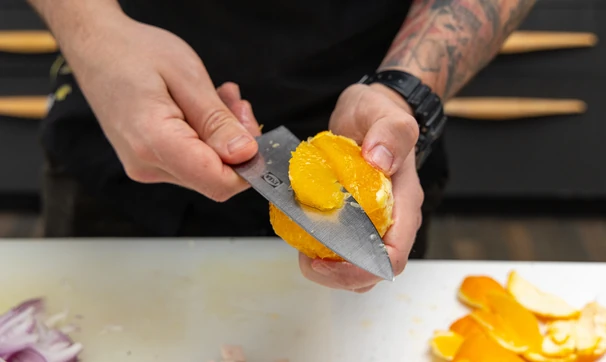 Красный лук нарежьте тонкими полукольцами. Апельсин очистите и разделите на сегменты.