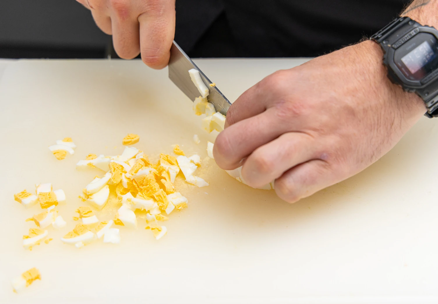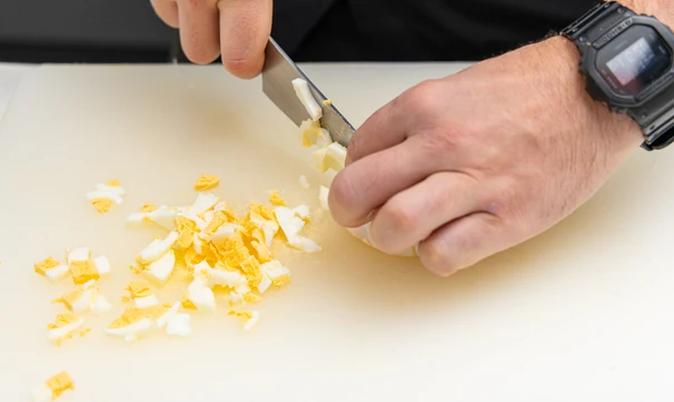 Яйца сварите вкрутую, затем залейте холодной водой, очистите и мелко порубите.