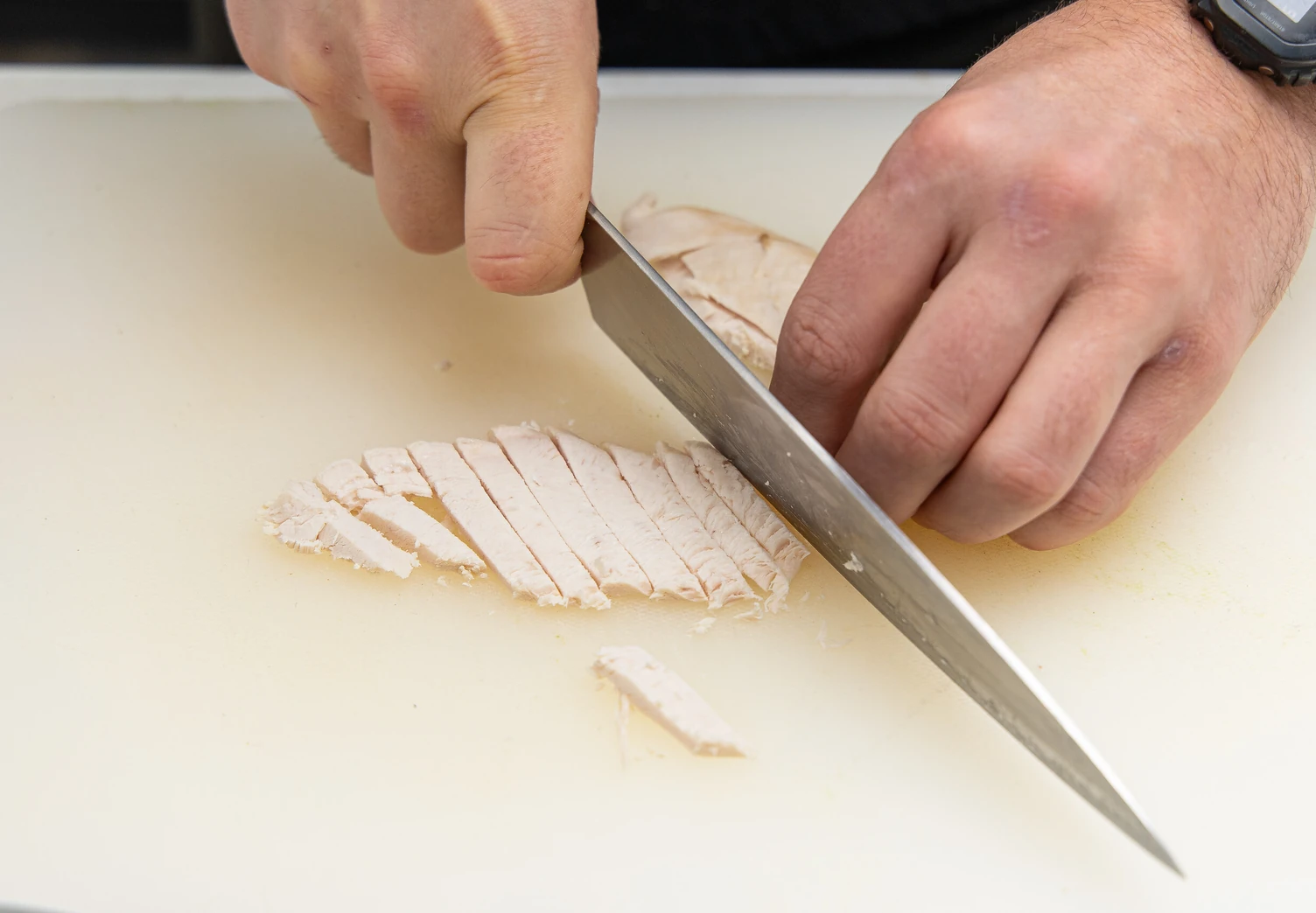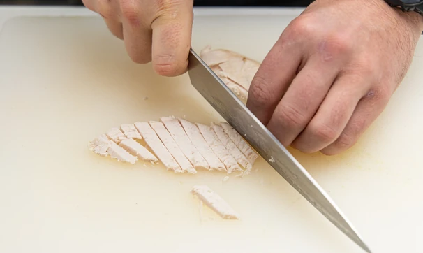 Нарежьте куриную грудку толстой соломкой.