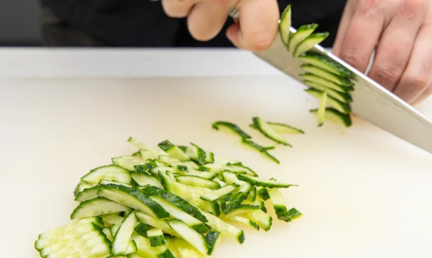 Таким же способом нарежьте огурцы и чернослив.