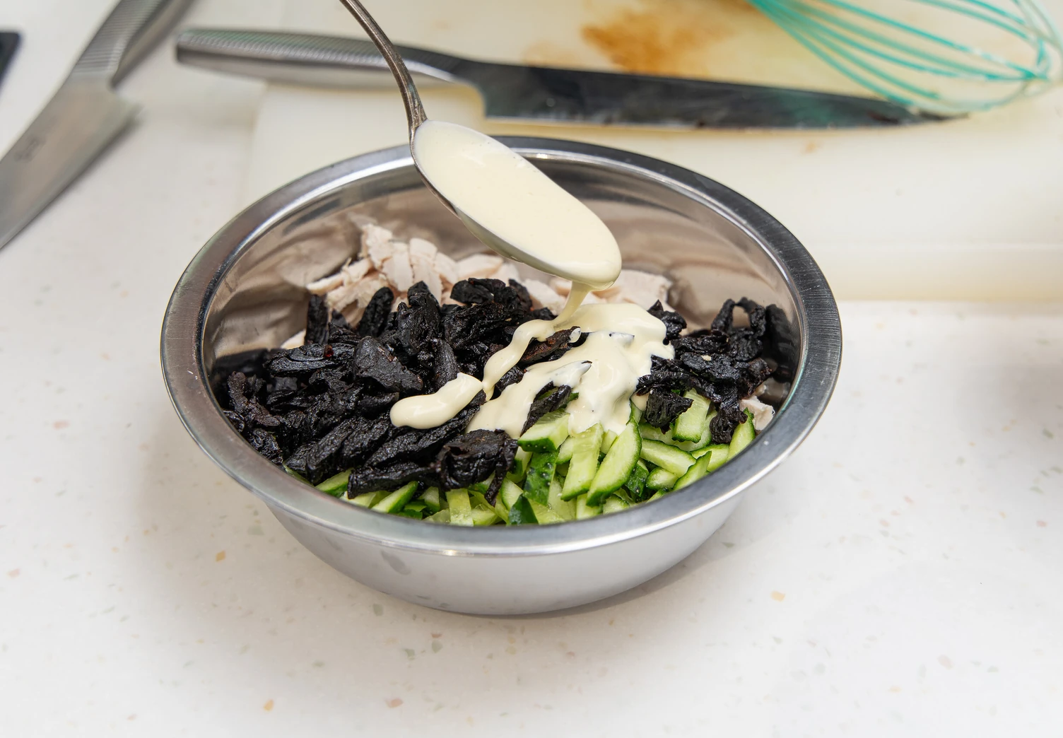 В отдельной емкости разбавьте майонез несколькими ложками оставшегося куриного бульона до однородной консистенции.
