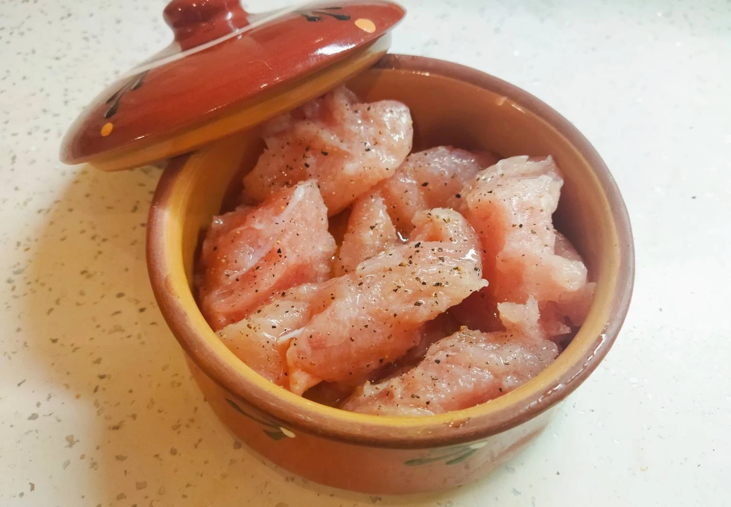 Для начала куриную грудку нужно нарезать небольшими кусочками, поперчить и посолить, добавить столовую ложку растительного масла. Дать помариноваться минут 30, после чего запечь в духовке при температуре 190 градусов около 30-40 минут (я запекала в горшочке, но можно и в рукаве).