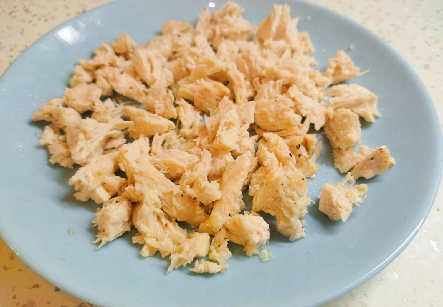 Затем в миску с майонезной заправкой добавить кусочки курицы и нарезанное яйцо, хорошо перемешать, немного посолить.
